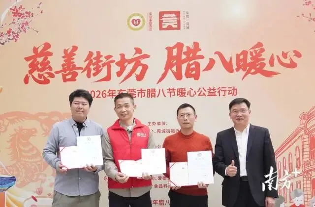 由东莞市慈善会联合莞城街道办事处主办的“慈善街坊,腊八暖心”2026年东莞市腊八节暖心公益行动举行。市民政局党组书记、局长兼市慈善会会长黄荣峰、莞城街道党工委书记李汉容等领导出席活动,与百余位志愿者一同为困难群体、独居老人、环卫工人、外卖员及协警辅警等送上热气腾腾的腊八粥和暖心礼包,用实际行动传递城市温情。