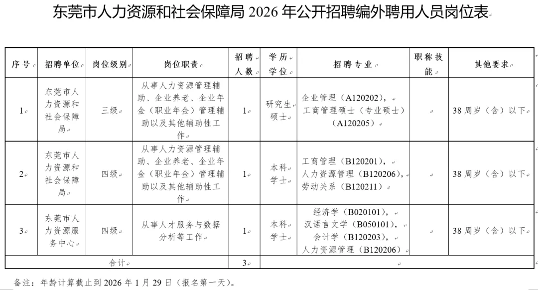 1.东莞市人力资源和社会保障局2026年公开招聘编外聘用人员岗位表