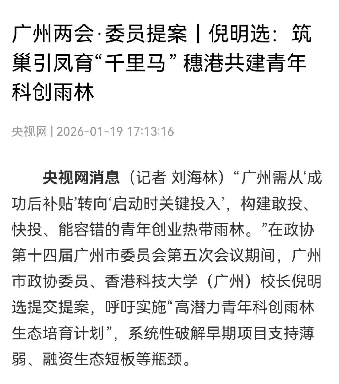 1月19日,央视网报道了倪明选校长提案的核心内容。针对广州将人才“流量”转化为发展“留量”所面对的挑战,倪明选校长呼吁实施“高潜力青年科创雨林生态培育计划”,如建议设立青年科学家创业专项基金,为高潜力项目提供50万元至200万元启动资金,并建立一月内拨款的绿色通道;细化国资容错清单,借鉴上海“批量下注、整体考核”模式;推出“一校一策”专项方案,设立“广州早鸟计划”支持概念验证;深化穗港联动,对接香港投资平台设立概念验证基金,推动香港科研与广州产业双向赋能;提高政府引导基金出资比例至60%以上,采用“民间定价、政府跟投”模式撬动社会资本;组建青年创业导师团,为重点团队配备服务专员,提供“无事不扰、有求必应”的精准陪跑等。