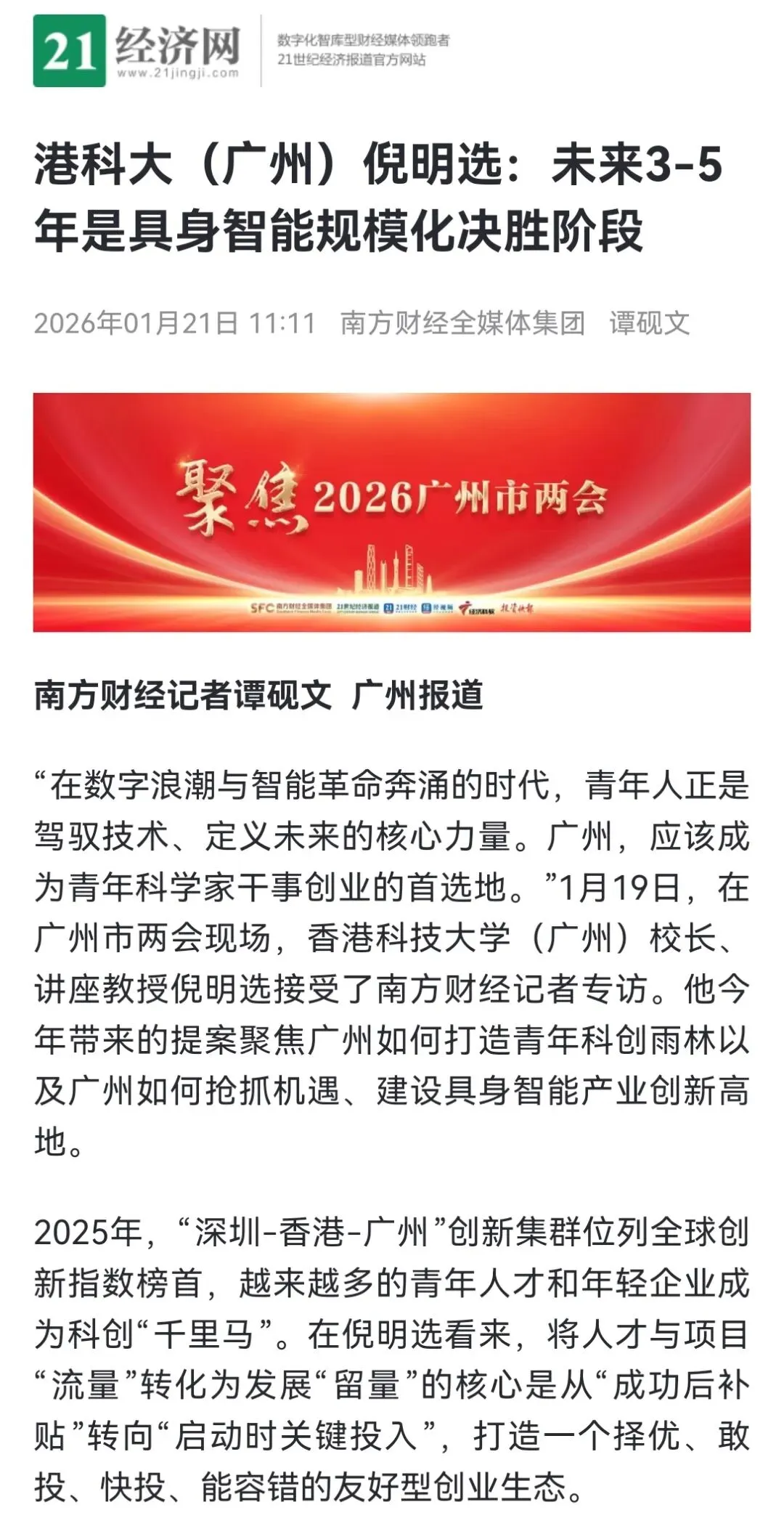 南方财经全媒体集团则在广州两会现场对倪明选校长进行了专访,针对他今年带来的提案,进行了更为深度的阐释和解读。在报道中,倪明选校长深入剖析了目前广州青年科创生态的瓶颈与破局之道,解释了港科大(广州)近期试点广州市“先投后股”模式的先进性和最新成果。更从他的角度,系统阐述了广州抢抓“具身智能”产业高地的具体方略。倪明选校长认为,“未来3-5年是具身智能规模化发展的决胜阶段”,并对标上海、深圳、杭州等城市,冷静分析了广州的优势、短板和发展机遇,就广州建设具身智能产业高地,给出了具有建设性的路径与方案:“研发策源、制造协同、场景联动”。
