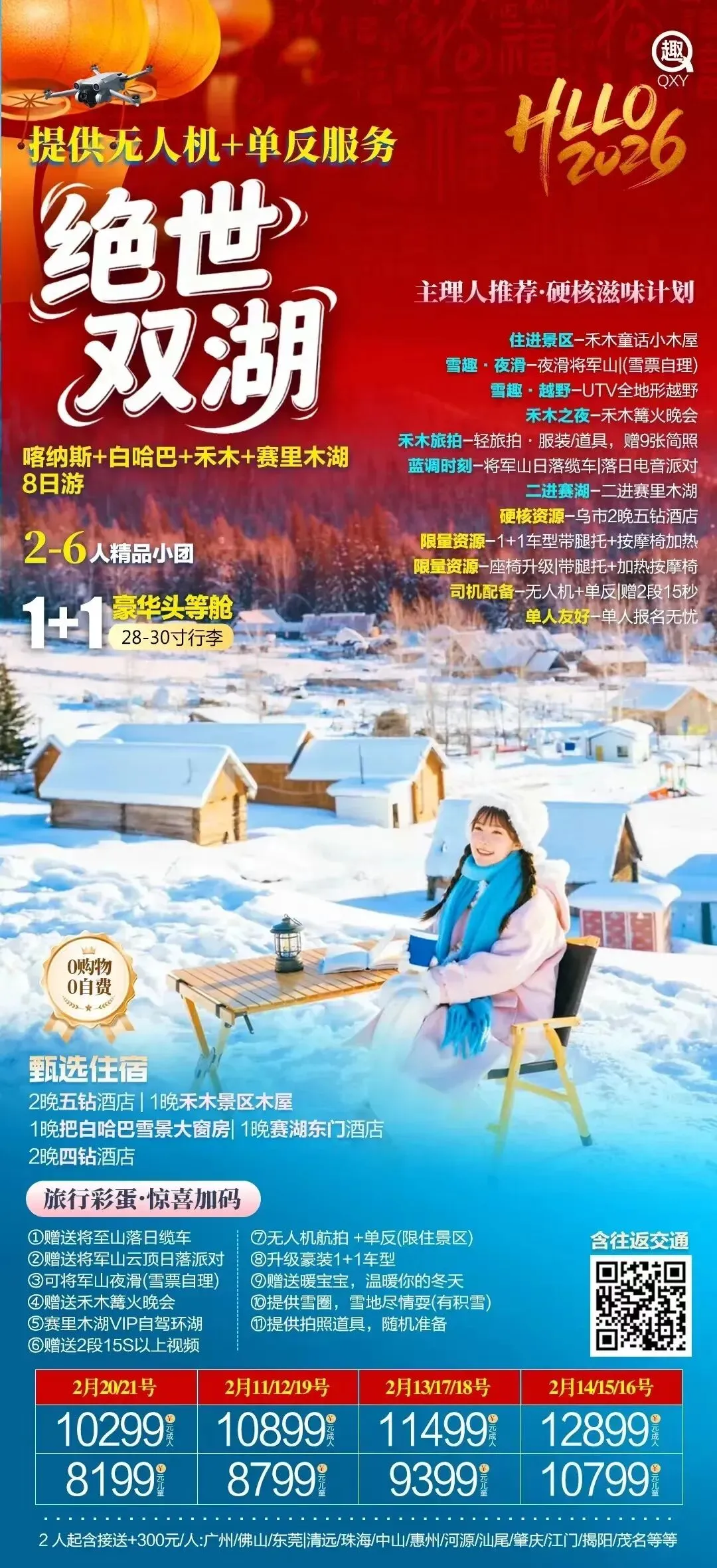 ◆ 深度游览喀纳斯、白哈巴、禾木村、赛里木湖四大核心景区,沉浸式入住禾木景区内独享冰雪秘境