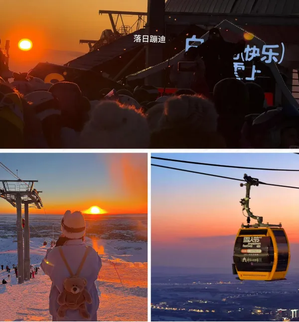 缆车缓缓爬升,橘色晚霞先撞进眼里,染得每片雪都发暖。等升到半空,蓝调天空悄悄漫上来,低头是被阿勒泰山环抱着的小城,灯火刚亮几星,安静得像被雪藏的童话。
