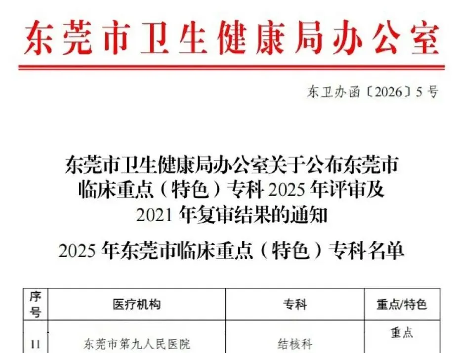 近日,东莞市第九人民医院结核科正式获评“东莞市临床重点专科”,标志着科室在学科建设、科研创新与诊疗能力上实现了新跨越!荣誉的背后,是医院多年来在结核病防治领域深耕不辍的坚实足迹。这份市级认证,不仅是一块“金字招牌”,更是对我们持续努力、全心投入的最好肯定。