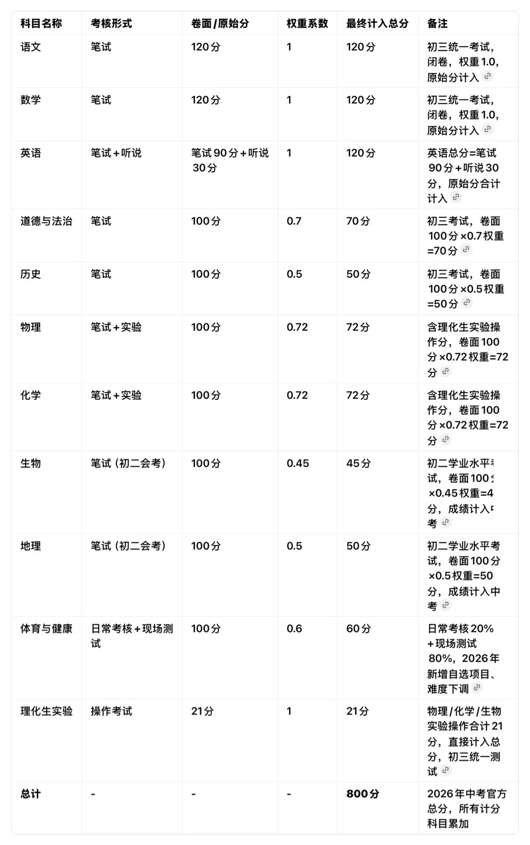 2026年仍按800分总分、10门计分科目核算成绩,生物、地理初二会考成绩直接计入中考总分,切勿忽视已考科目但需关注等级复核。