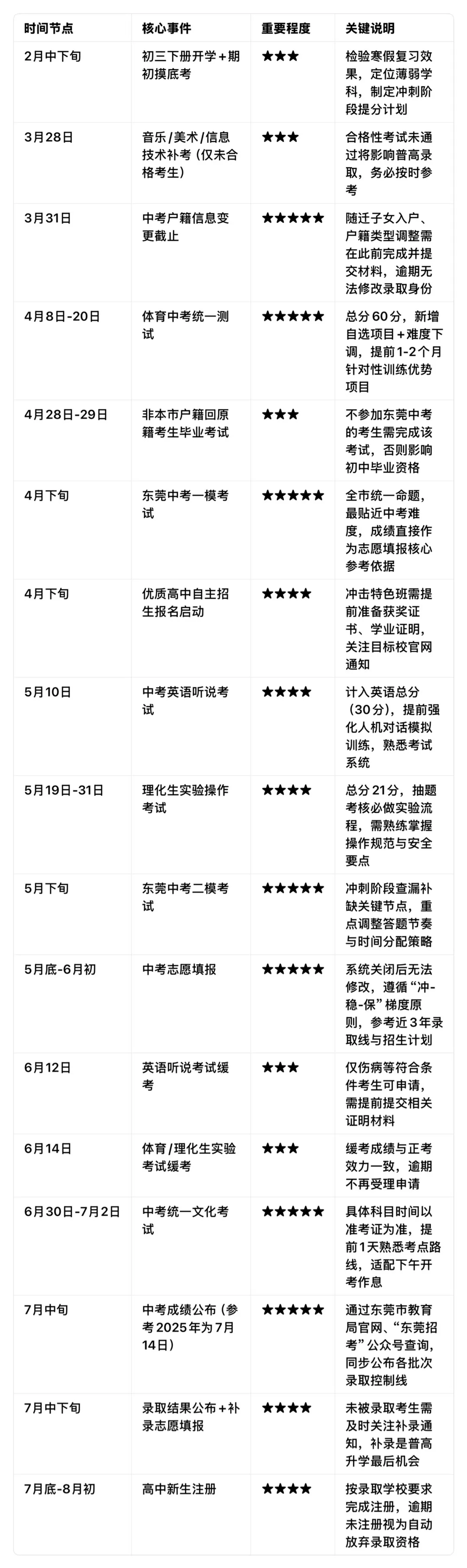 复习近5年东莞中考真题,每周2套完整模拟(严格按中考时间);志愿填报前对比目标高中近3年“录取线+招生计划变化”,避免盲目冲高或保底不足。
