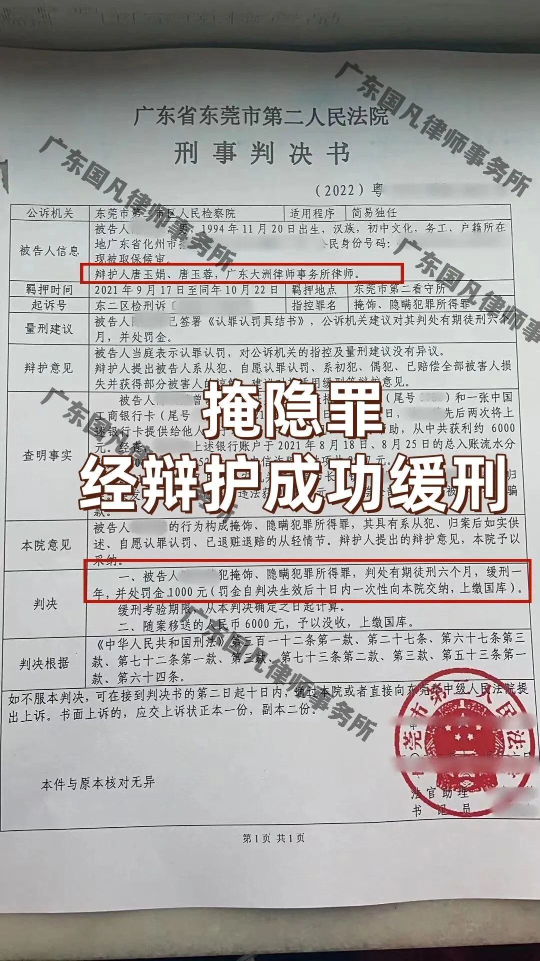 后案件移送审查起诉,团队律师第一时间去检察院阅卷,整理被害人信息,本案中张三的银行卡流入的诈骗金额总共9900元,共13位被害人。团队律师一一进行整理沟通,最终取得大部分被害人的刑事谅解,赔偿了所有被害人的被诈骗款。到法院审判阶段,开庭时提出被告人认罪认罚,系初犯、偶犯,已赔偿全部被害人损失并获得大部分被害人谅解,建议适用缓刑辩护意见。法院采纳了团队律师的辩护意见,对其适用缓刑。