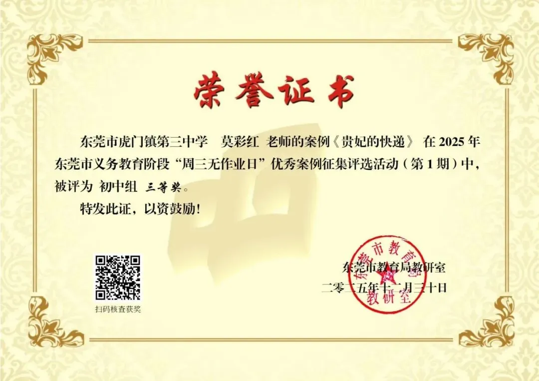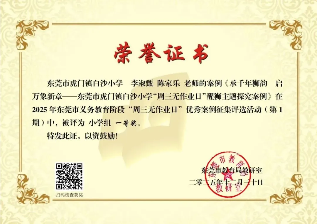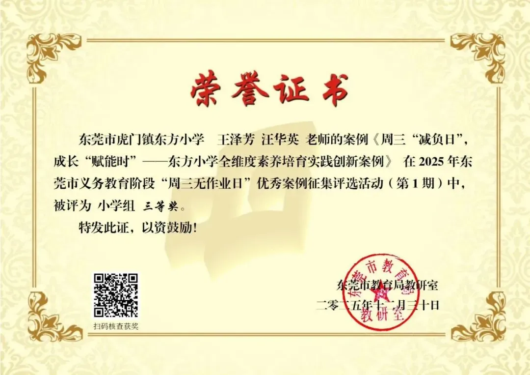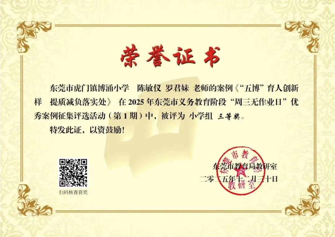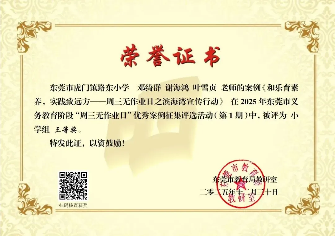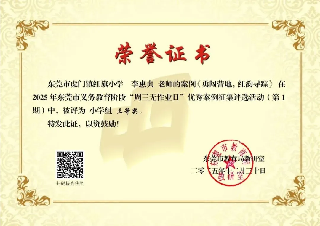近日,东莞市教育局教研室公布了义务教育阶段“周三无作业日”优秀案例征集评选活动(第1期)获奖名单。虎门镇报送的案例中,共有 6 个案例荣获市级奖项,其中一等奖 1 项、三等奖 5 项(详见获奖名单),充分体现了我镇在作业管理改革和促进学生全面发展方面的积极探索与阶段性成效。近年来,虎门镇深入贯彻落实国家和省、市关于“双减”和作业管理工作的系列部署,坚持以正确育人观引领教育教学改革创新,将“周三无作业日”作为深化作业管理改革、促进学生身心健康和全面发展的重要抓手,持续推进减负提质与育人方式转变,逐步打造兼具育人内涵与实践价值的特色育人品牌。在“周三无作业日”实践中,虎门镇各学校坚持“无书面作业、重体验活动、促全面发展”的工作导向,以“阅读—运动—劳动—艺术—亲子”等主题为主线,统筹推进共性活动与校本特色项目。各校既开展主题阅读、体育锻炼、劳动实践等常态化活动,也结合办学特色融入影视欣赏、科学探究、心理体验活动、英语口语互动、家庭实践任务等内容,让学生在轻松愉悦的参与体验中获得成长,生动体现了“寓教于乐、以活动促发展”的育人理念。下一步,虎门镇将以此次获奖为契机,持续深化“作业优化设计”与“周三无作业日”实践研究,系统总结和推广有效经验,推动作业管理改革与学生全面发展协同发力,为构建高质量的基础教育生态持续赋能。供稿:义务组