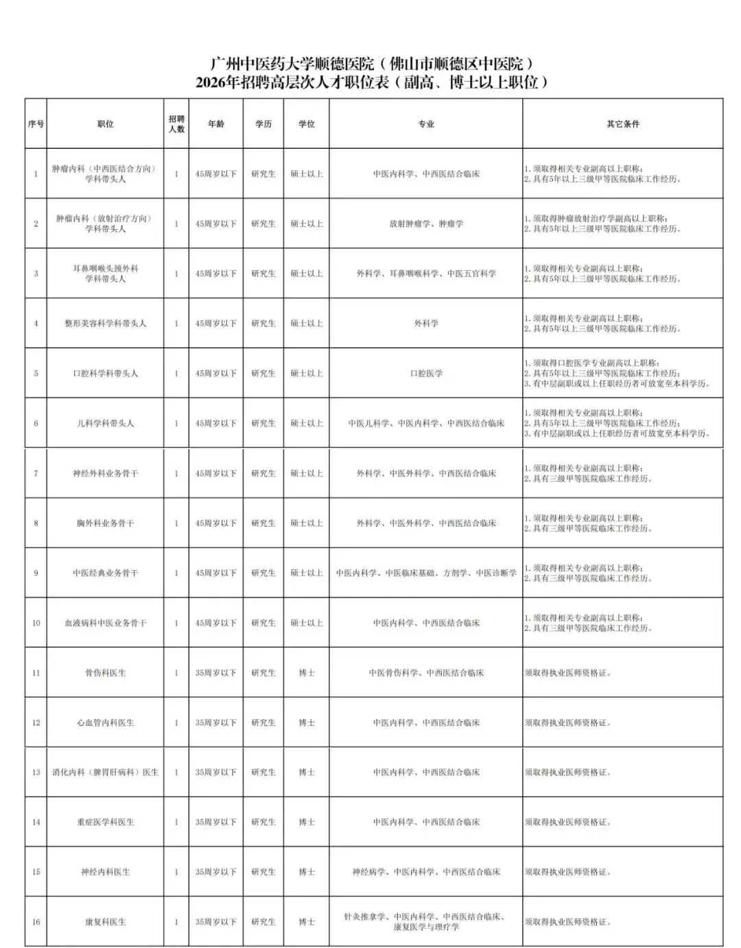 (七)岗位所需的其他条件见《广州中医药大学顺德医院(佛山市顺德区中医院)2026年招聘工作人员职位表》(附件);