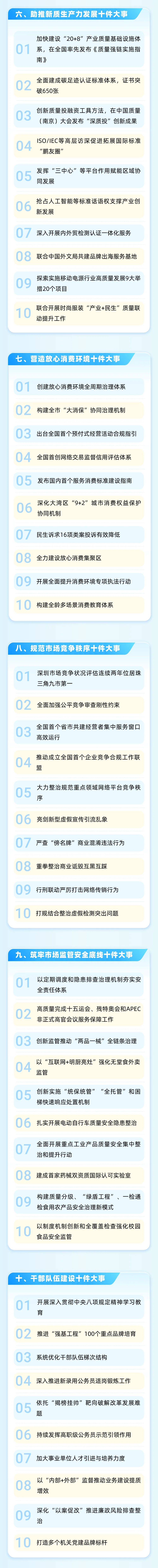 十要聚力高标准做好APEC会议等重大活动服务保障,在彰显市场监管使命担当上立标争先。建立健全“统一指挥、分级负责、重点保障、协同联动”的指挥保障体系,开展APEC知识产权保护专项行动,筑牢食品药品特种设备等重点领域安全防线,全面提升重大活动服务保障效能。
