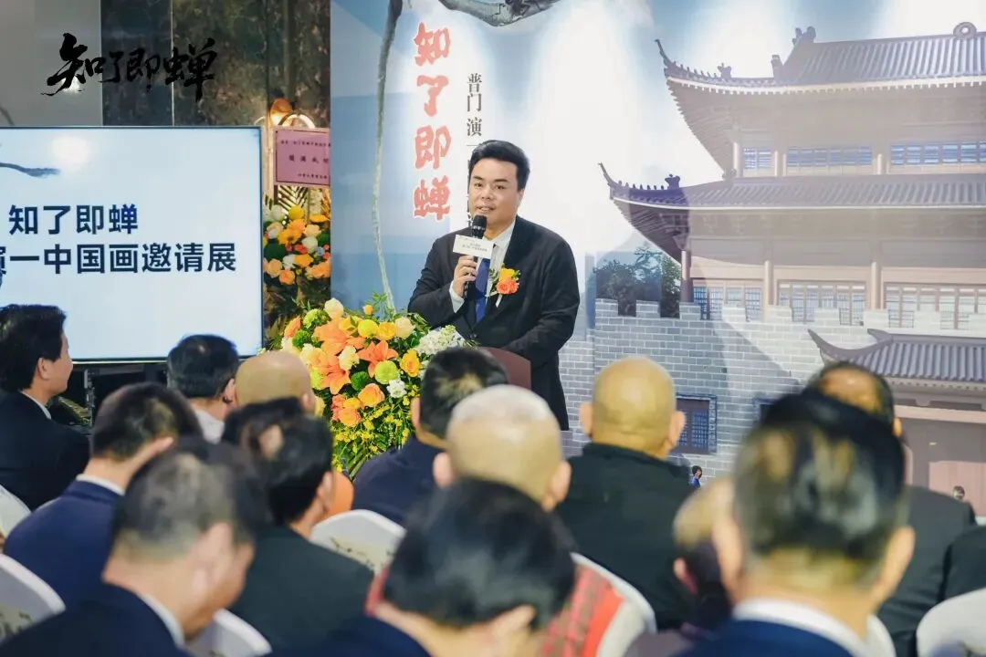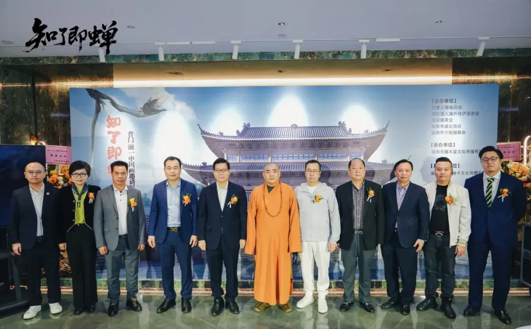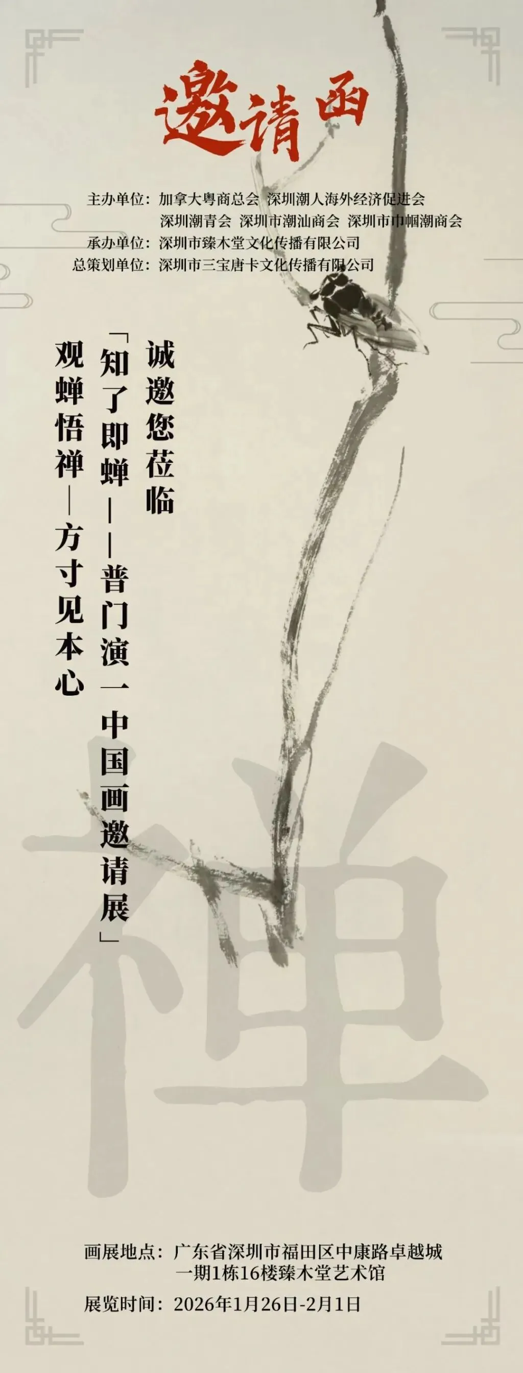 2026年1月26日,恰逢释迦摩尼佛成道之日,亦是腊八佳节之时,法喜充盈!由加拿大粤商总会、深圳潮人海外经济促进会、深圳潮青会、深圳市潮汕商会、深圳市巾帼潮商会共同主办,深圳市臻木堂文化传播有限公司承办,深圳市三宝唐卡文化有限公司总策划的"知了即蝉"普门演一中国画邀请展,在深圳臻木堂艺术馆悠然启幕。各界嘉宾云集,于新年新月之际,暂别尘世喧闹,共赴一场艺术与禅意交织的心灵之约。