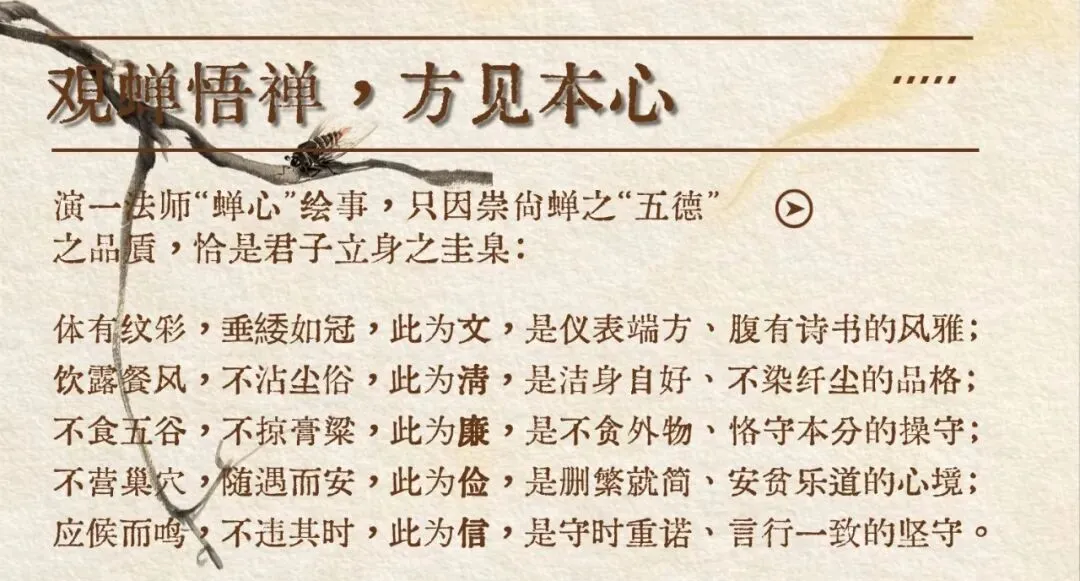 核心意象“蝉”成为解读演一法师艺术世界的钥匙。法师深崇蝉之“五德”——文、清、廉、俭、信,将这一自然生灵升华为君子品格与禅者心性的象征。在其笔下,无论是栖于枯枝的孤蝉,还是幽林间的罗汉,皆非简单的物象描摹,而是“一念觉悟”的精神载体。