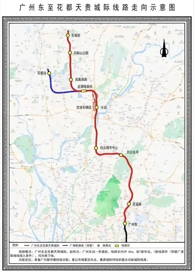 广花城际线路起于18号线已运营的广州东站,向北途径京溪路、白云东平、白云城市中心,连接方石、凤凰南路、马鞍山公园,止于花都花城街站,新建7座车站,线路长39.6公里,设计速度160公里/小时。