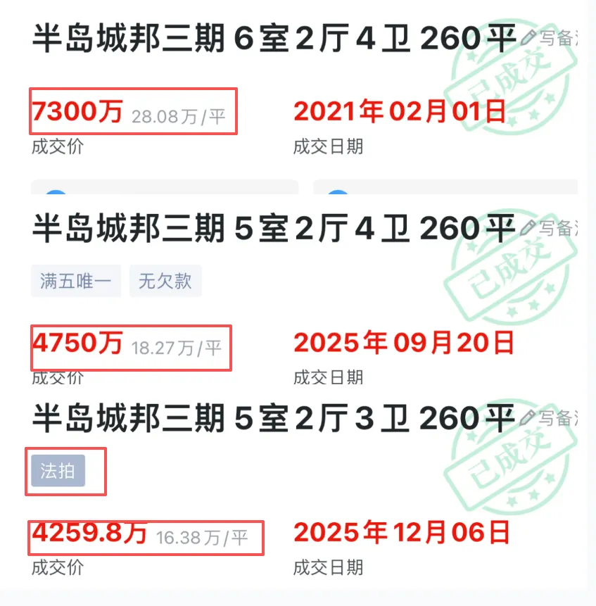 2022年市场狂热期:挂牌价一度冲上7300万,看房需验资2025年9月,市场冷静期:成交价4750万,已较高点回调超2500万2025年12月,法拍风向标:同户型法拍4259万成交现在:产权满五唯一,业主诚心报价4480万