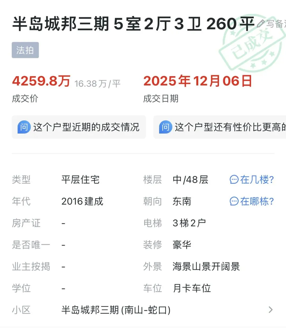 当前约17.2万元/㎡的单价,不仅比高点回落近40%,与去年底4259万的法拍价也极为接近。法拍价往往被视为市场的“硬底价”,显示价格泡沫已被充分挤出。同时,对比近期深圳湾新盘动辄35万/㎡+的单价,此价格仅为其一半,价值比凸显。