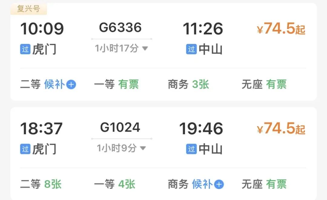 去程:G6336 10:09-11:54
