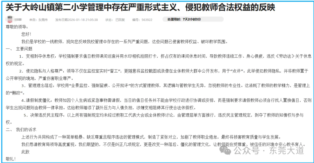 近日(1月18日),一位一线教师通过东莞阳光热线问政平台发文,反映大岭山镇第二小学存在“严重形式主义管理”和“侵犯教师合法权益”等问题。刚刚,大岭山镇教育管理中心回复了。