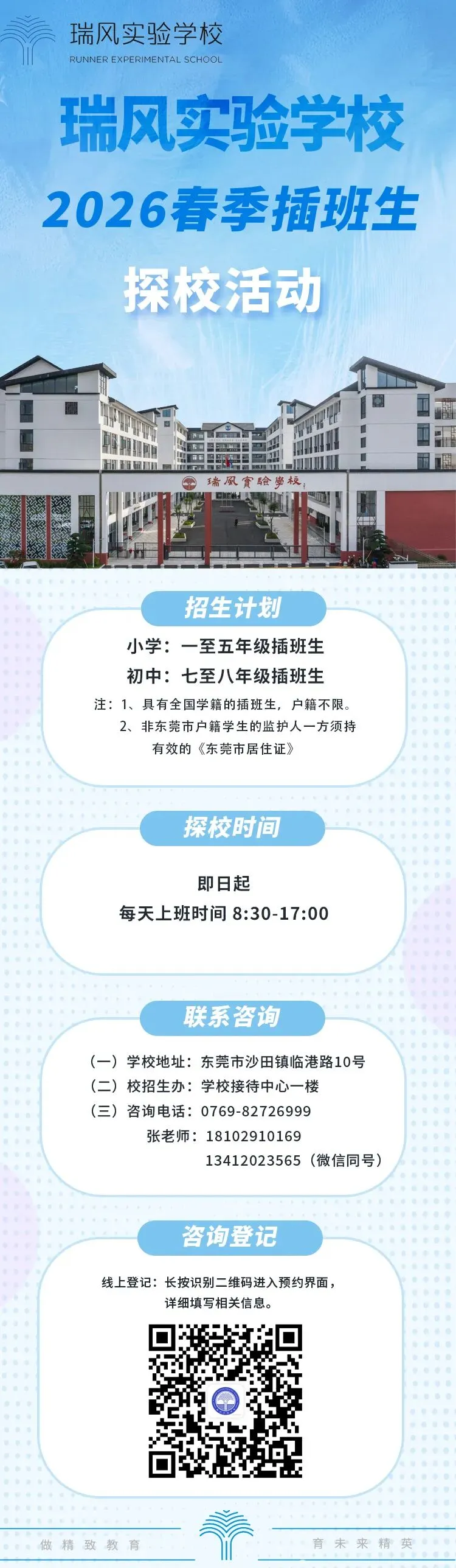 东莞市沙田瑞风实验学校2026年春季插班生招生正式启动!