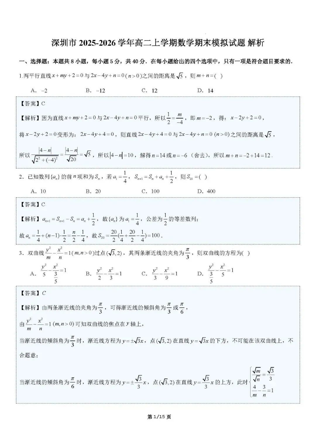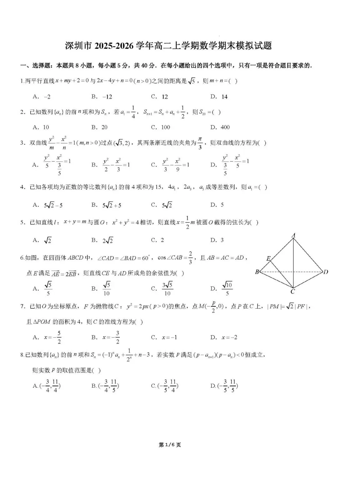>深圳市2025-2026学年高二上学期数学期末模拟试题