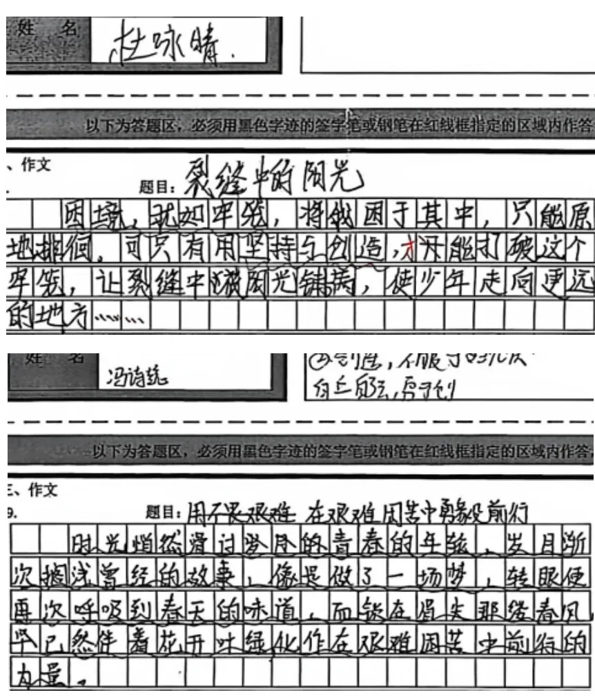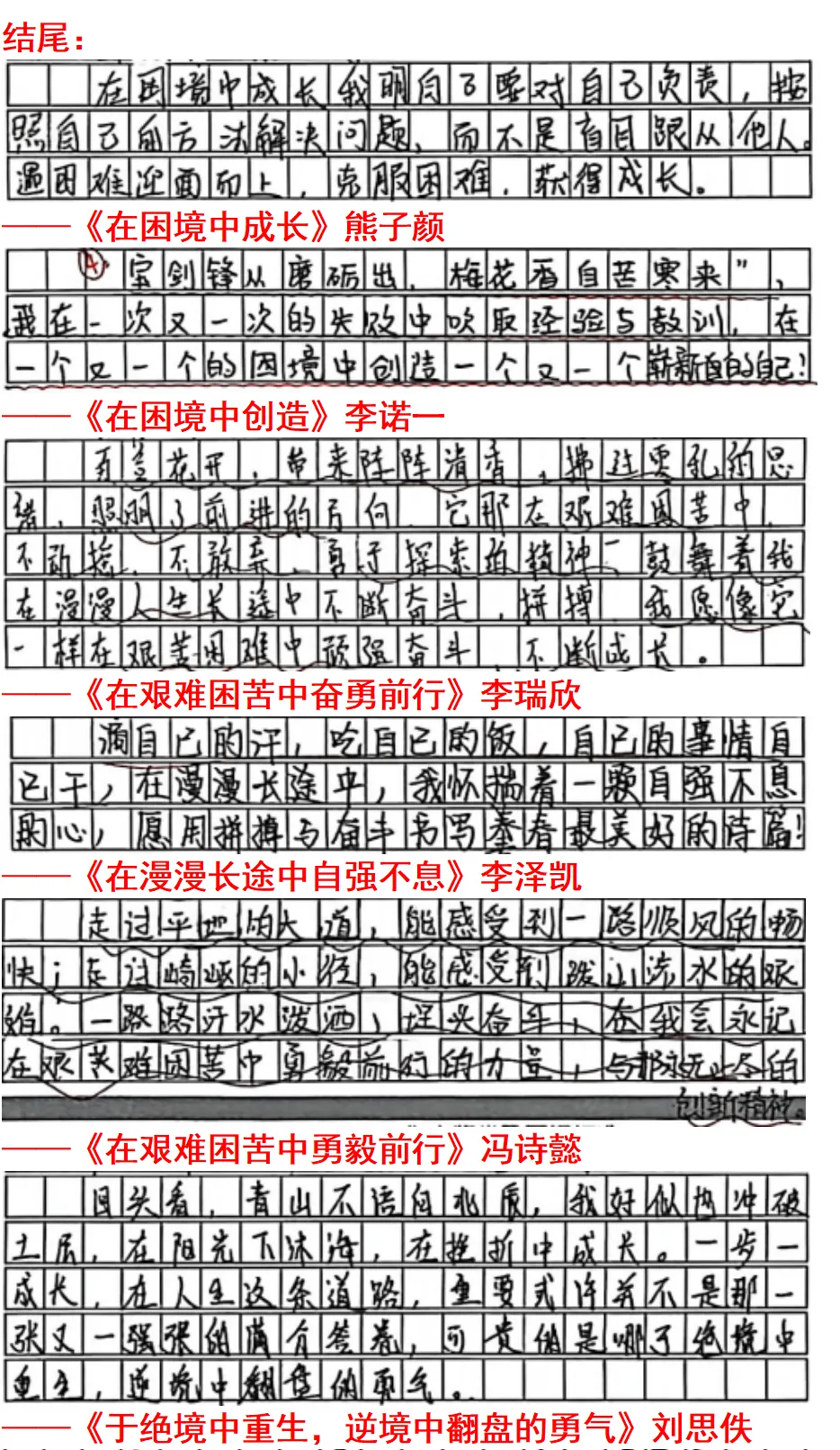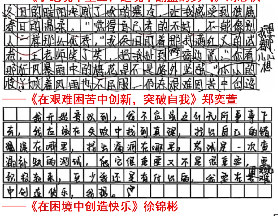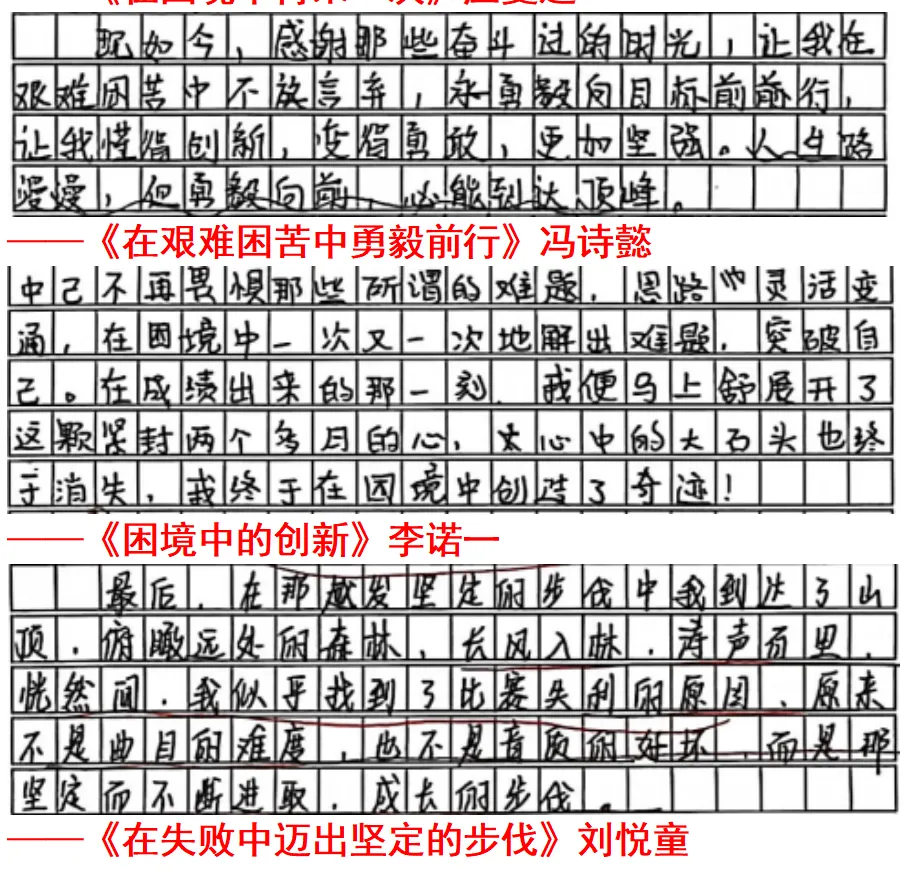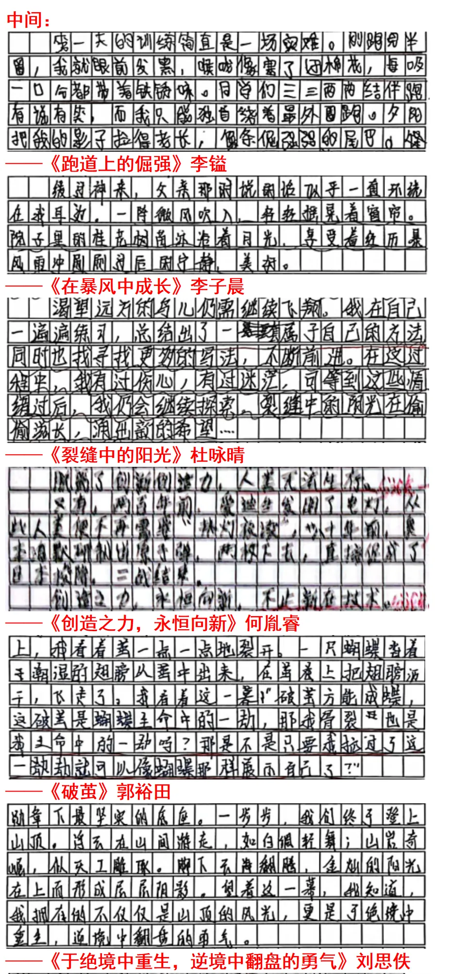 从那时开始,我会认真对待每次的试卷,及时查缺补漏,开始向老师请教问题,开始复盘每次的课程。但好像都没有任何起色。可我却始终相信在艰难中不动摇向前创造,定能创造奇迹。我慢慢在其中摸索出方法,比如:学习时要懂得复习和预习,不要一味地去刷题;要懂得总结问题及时补充。慢慢地我把自己埋在那张书桌里,每天面对着各种书籍。我也想过放弃,但又会常常幻想坚持下来的欣喜,希望自己也能成为前五中的一位。随着一周周的检测,成绩一点点的提升,我知道我在艰难中走了出来。