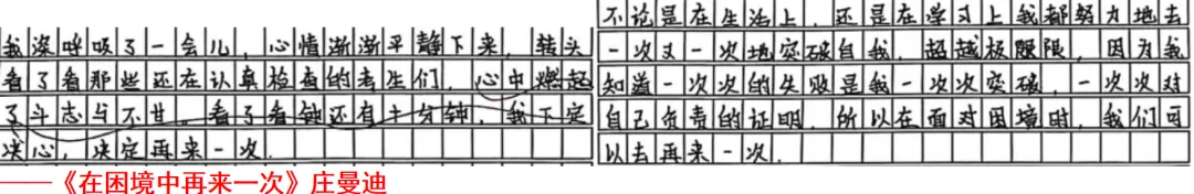 再来一次不是对上一次失败的逃避,而是对下一次充满希望与期待,回望当时,卷子上那凌乱的步骤到思路严谨的过程,不正是我一次次突破困境的最好证明吗?所以,当我们身处困境中时,放下上次,尝试再来一次。