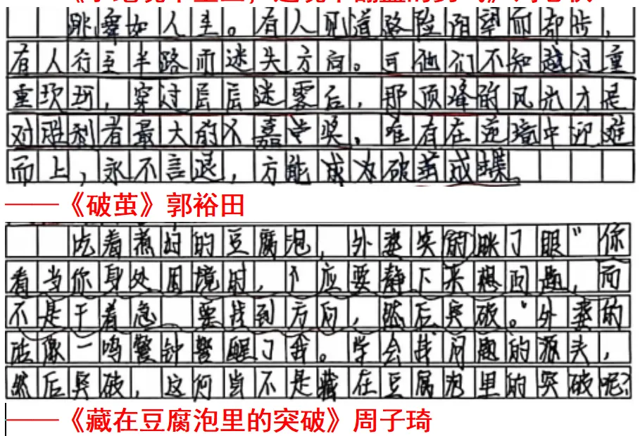 又一日,雨依旧未停,我独自去看那茧,发现那蝶正挣扎着想挣脱,一半身子露在外面,另一半仍然被茧所束缚,它挣扎着,每一次蠕动时好似都带着疼痛,我的眼神不再迷茫,连蝶都在如此艰难的困境中突破自我,这样的可贵怎能不令人佩服呢!