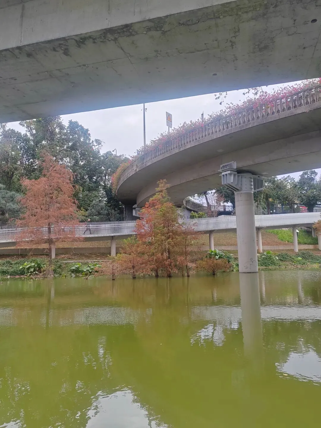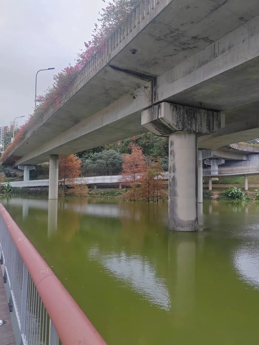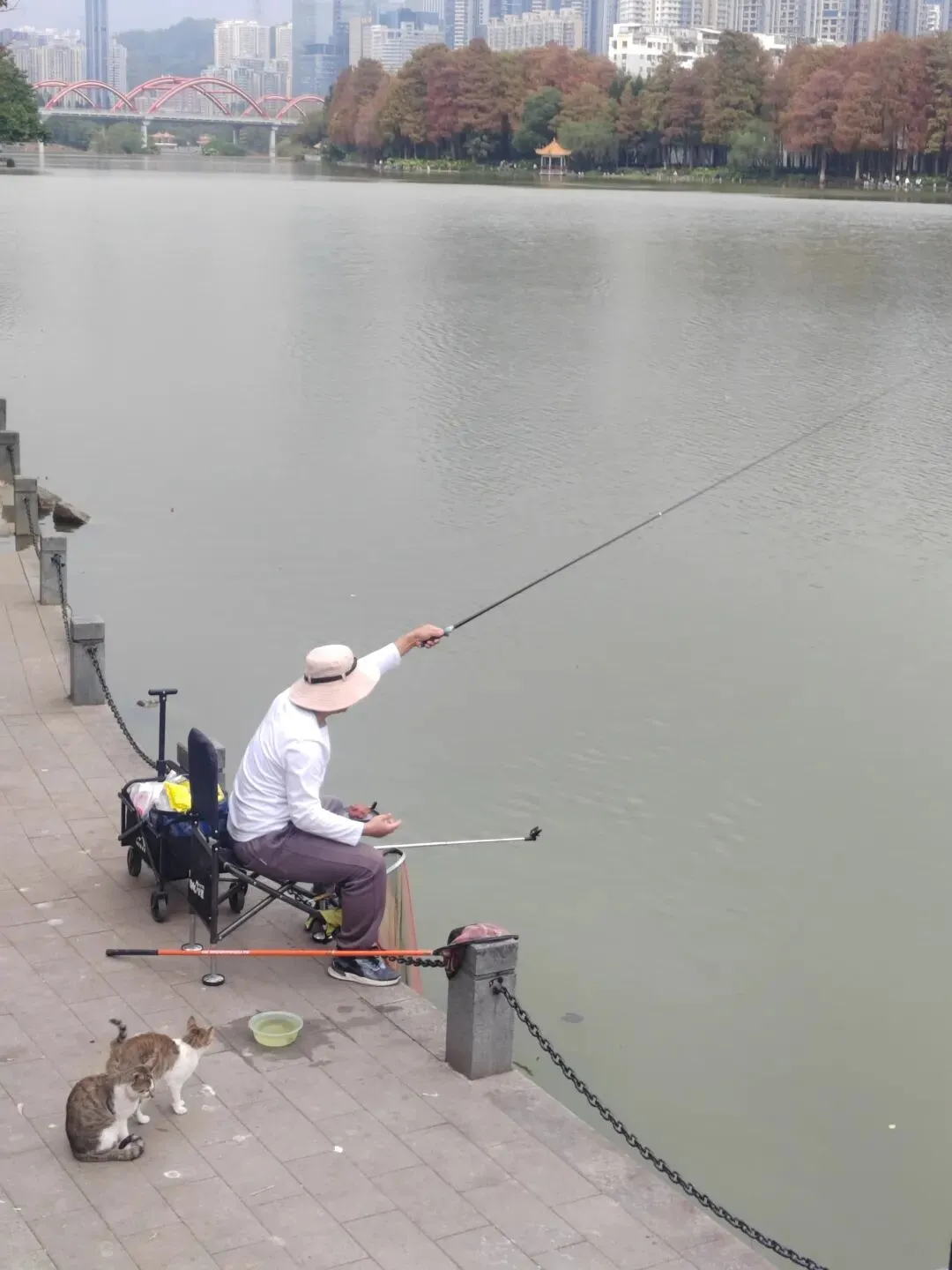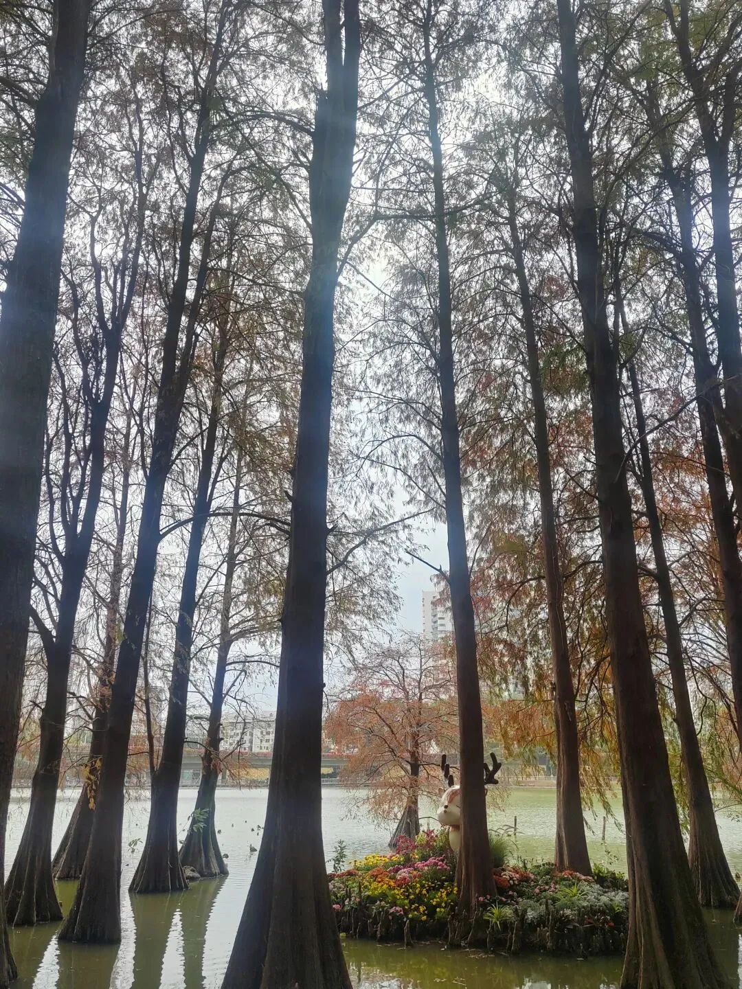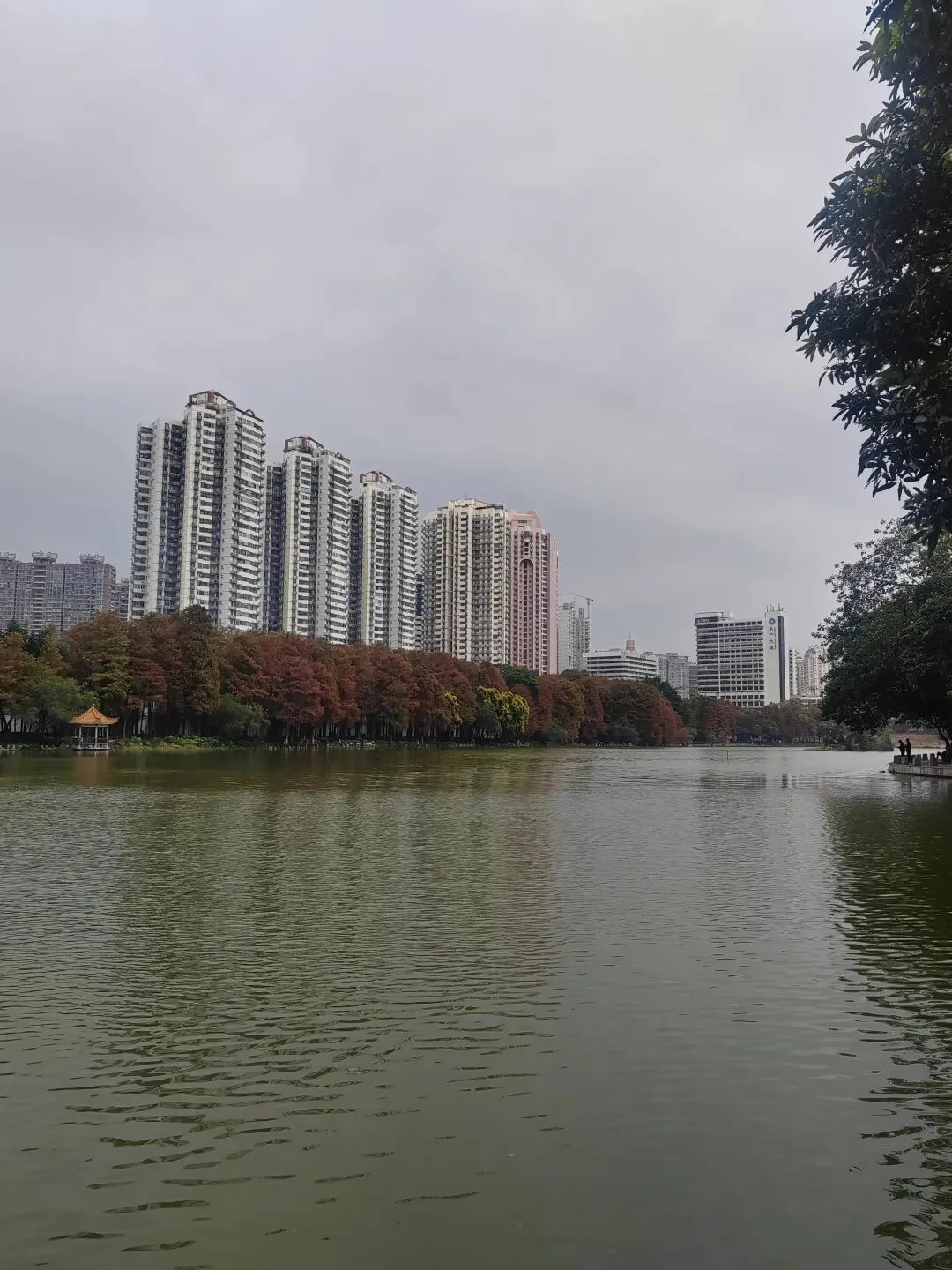虽然不是盛夏,暂时看不到每年的荷花展。但如今水面上零星的小荷,也别有一番雅致。岸边的鸟儿闲庭信步,若有所思的样子。几乎不惧怕游人,我在旁边的休息长椅坐着,它也旁若无人地走来走去。这足以证明此处人与鸟儿相处得多么融洽。湖面之上,有几处亭楼连廊,可供大家闲坐观赏风景。是日见到十来个大妈聚在亭子里唱歌,占得一方空间,几乎没有游人靠近,本无可厚非,但当时感觉有点过犹不及。远处红色的拱型桥,也是洪湖公园的典型美景。虹桥与水面的倒影,形成了一幅美丽的风景画。湖边许多人在垂钓,公园的猫咪也不时走近,等候钓鱼者的投喂。岸边步道行人走过会放慢脚步,交谈的人儿也会放低音量,一切都那么的融洽。与湖面另一面的大妈KTV相比,我感觉好多了。要说环境之美尚可堆造,但这闲适的人文气息确是不可复制的。我相信一个地方的魅力,人在其间的影响比重理应是巨大的。身为地方居民,应该为自己的地方加分,注意在公共环境中的言行举止。彼岸连绵不绝的一排落羽杉,更是此行的一个巨大惊喜。之前我认为宝安的九围湿地公园的落羽杉栈道在深圳应该无敌了,此时面对眼前的风景,我又动摇了。来到彼岸,这边的花,这边的水杉,美得让人走不动。摄影爱好者聚集此地,有带着模特人儿的,有拍鸟儿的,也有直拍风景的。爱摄之人,根本无力抵抗这样的美景,脚都拔不动,久久的停留在此。虽然我迫切的希望通过我的照片和只言片语告诉你我所感受到的震撼感受,但确实能力之所及不足一二,仅供您参考参考,有机会你也自己来亲自体验吧。个人表示我很喜欢,推荐这里。最后,感谢你耐心阅读至此,希望得到你的点赞关注支持,感谢。🙏