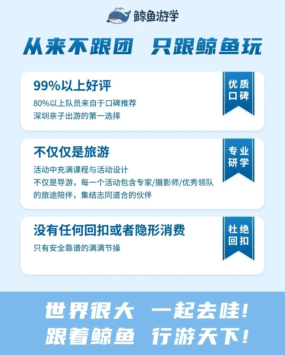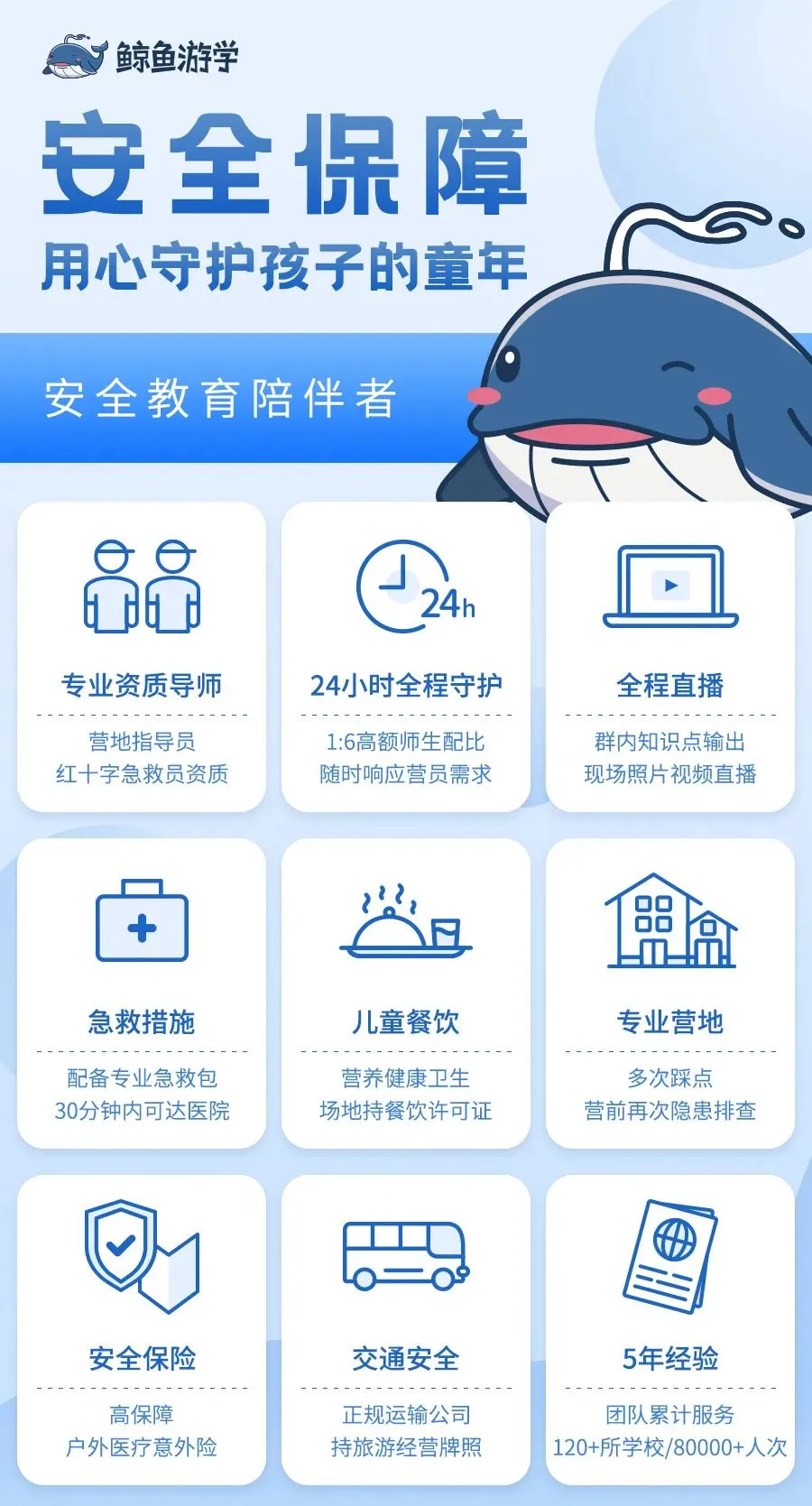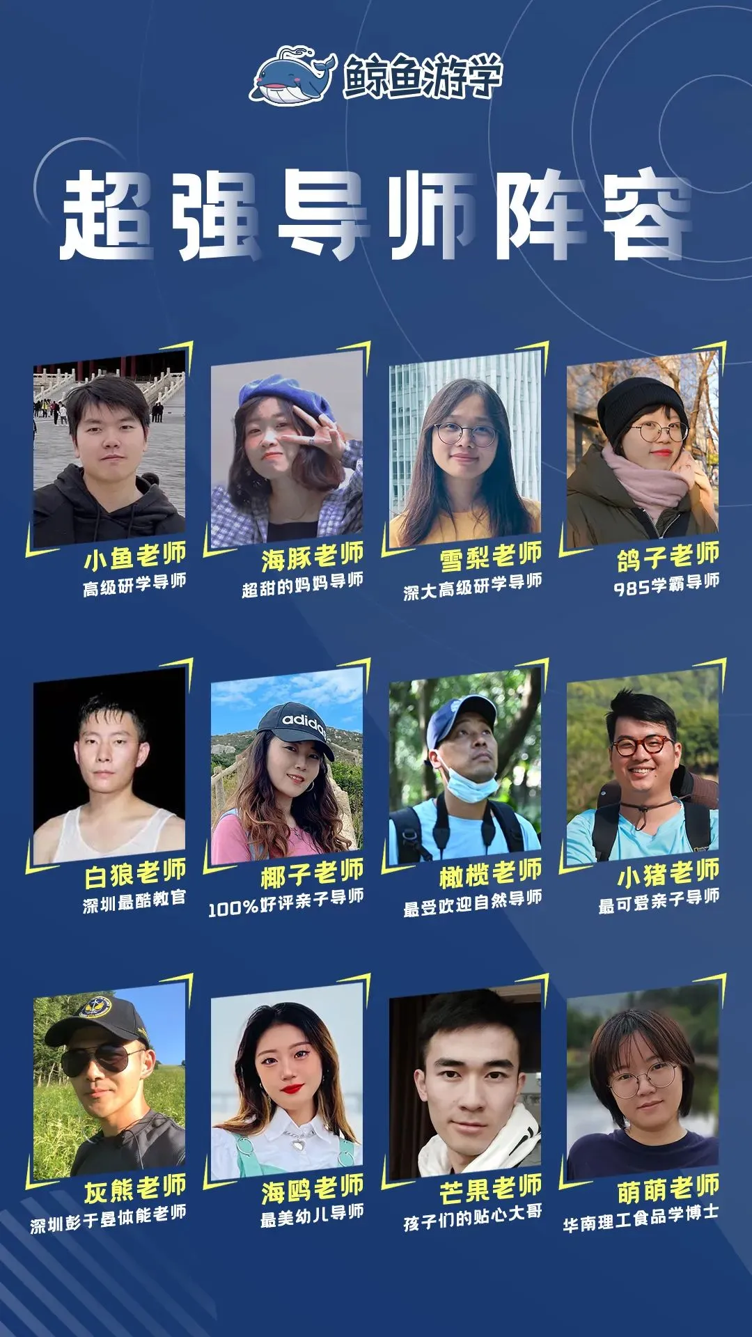 鲸鱼游学团队均为行业资深导师,每一位都经过严格挑选和培训,在细心照顾孩子需求的同时关注孩子的成长。每个营期都会安排主教练、直播拍摄导师、生活导师等不同角色,给予更多安全保障和后勤辅助。