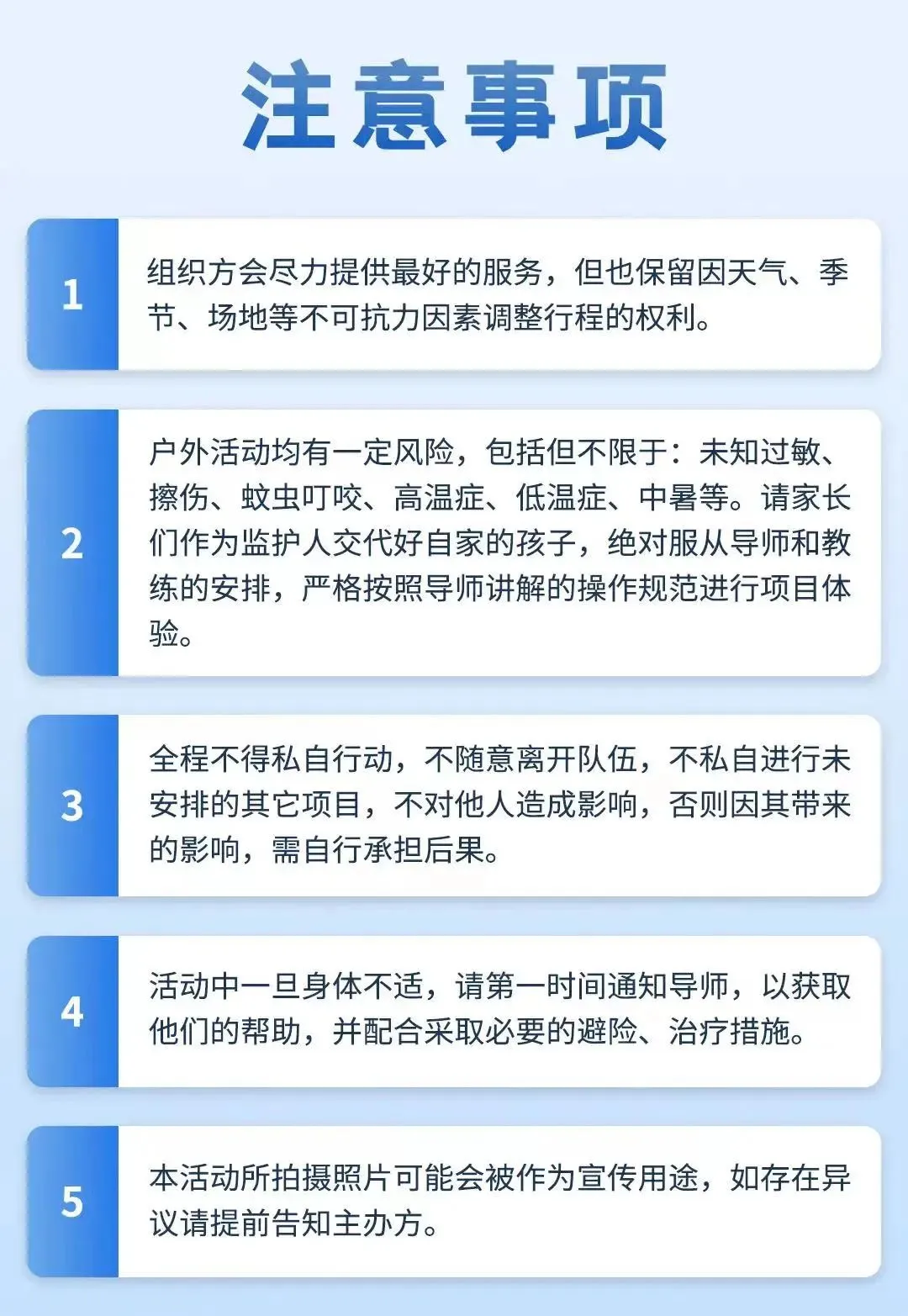 活动前48h无条件退款,24h到48h内因身体原因接受取消并100%退款,24h内取消需扣除报名费的50%。如遇大雨等不可抗因素,则延期或取消,以实际情况为准