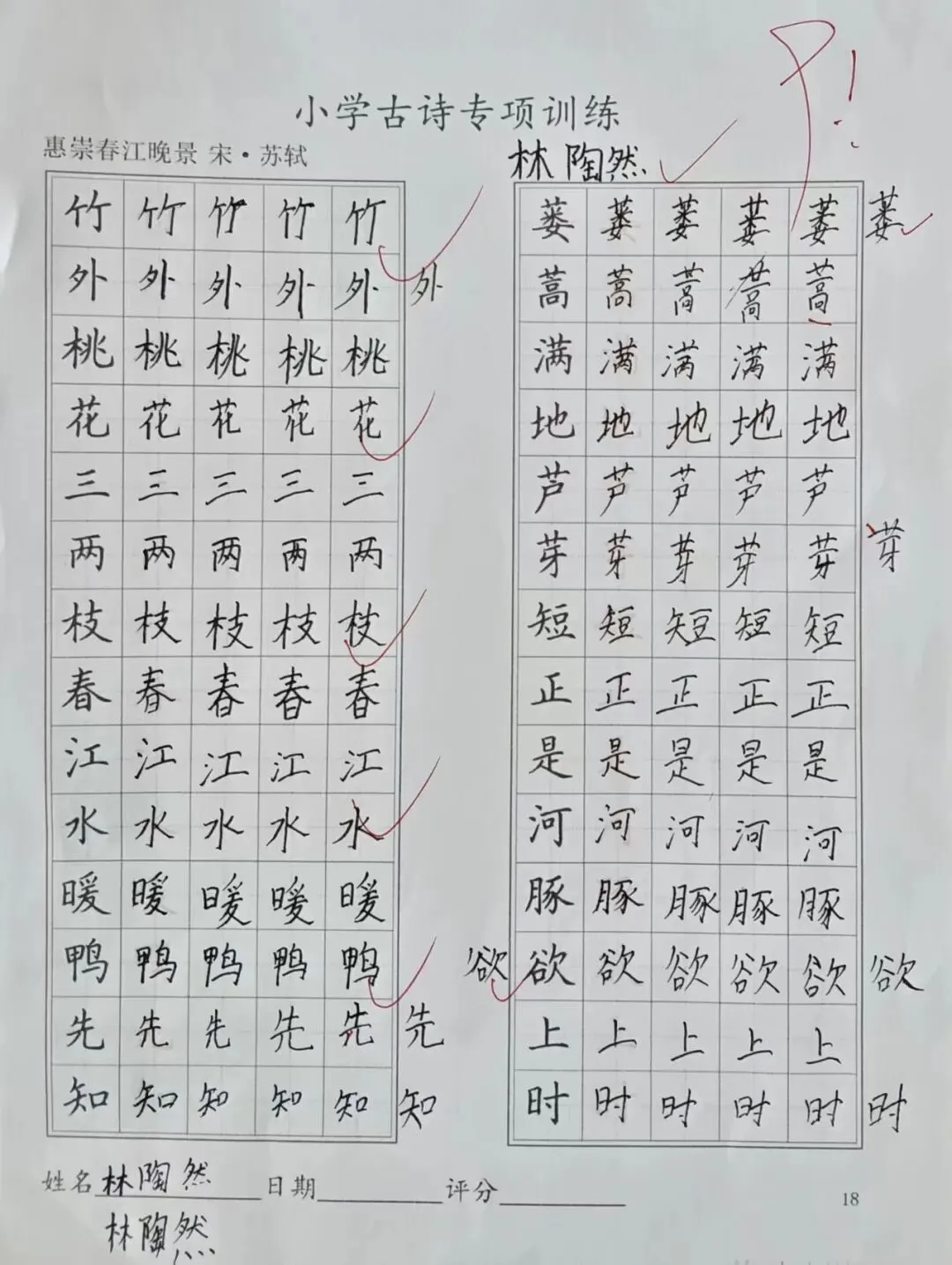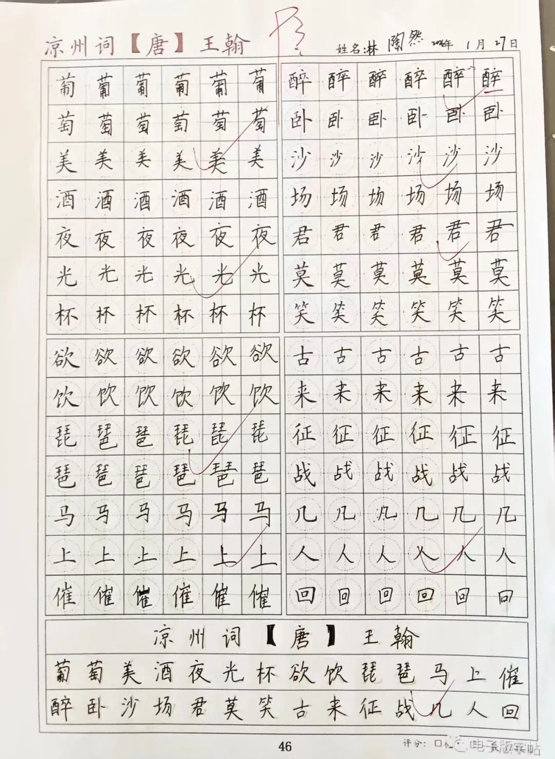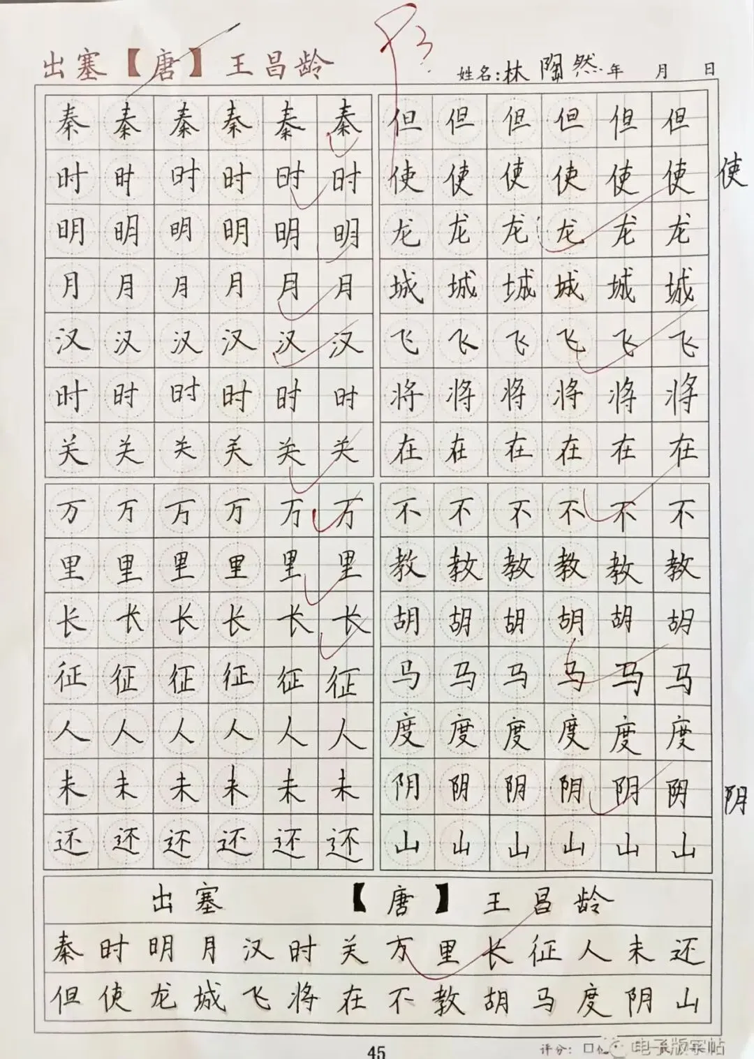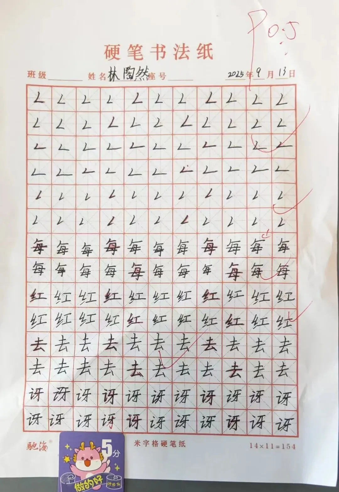 从提交的多份练习作品来看,能清晰看到林陶然的书写进步和扎实的练习痕迹,整体表现可圈可点:从9月到1月的练习中,横、竖、撇、捺等基础笔画的形态越来越稳定。像斜撇、竖钩的起笔收笔动作更清晰,线条的力度和流畅度也明显提升,说明你对笔画的控制能力在稳步增强。在“每、红、去”等独体字和“家、猫、独”等合体字的练习里,你越来越注意字的间架结构。例如“家”字宝盖头的覆盖感、“猫”字左右部分的比例,都处理得越来越合理,整体字形更匀称。在《出塞》《凉州词》等古诗作品中,你能完整、准确地书写整首诗,字迹工整,卷面整洁,体现了良好的书写习惯和认真的学习态度。从笔画专项到单字、古诗的系统训练,能看出你坚持了大量练习。这让你的书写熟练度和稳定性都有了明显进步,从早期偶尔的字形歪斜,到现在整体风格越来越统一。1.字形大小与位置需更精准在米字格中,部分字的大小不够均匀,有些字会偏上或偏下。建议书写前先观察字的重心,比如“水”字的竖钩要对准竖中线,“日”字要写在格子中央,保持整体布局的整齐。像“琵琶”“蒌蒿”这类笔画较多的字,容易出现笔画粘连或结构松散的问题。可以先拆解成部件练习,比如“琵”=“比+王+王”,先练熟部件再组合,让字形更紧凑美观。- 针对性纠错:在单字稳定后,增加行、列的整体练习,注意字间距和行间距的均匀。- 临摹结合:选择优秀的硬笔书法字帖,先摹写再临写,对比自己的字形,逐步修正细节。总的来说,你的书写已经打下了不错的基础,只要在细节上多下功夫,坚持练习,一定会有更大的突破!