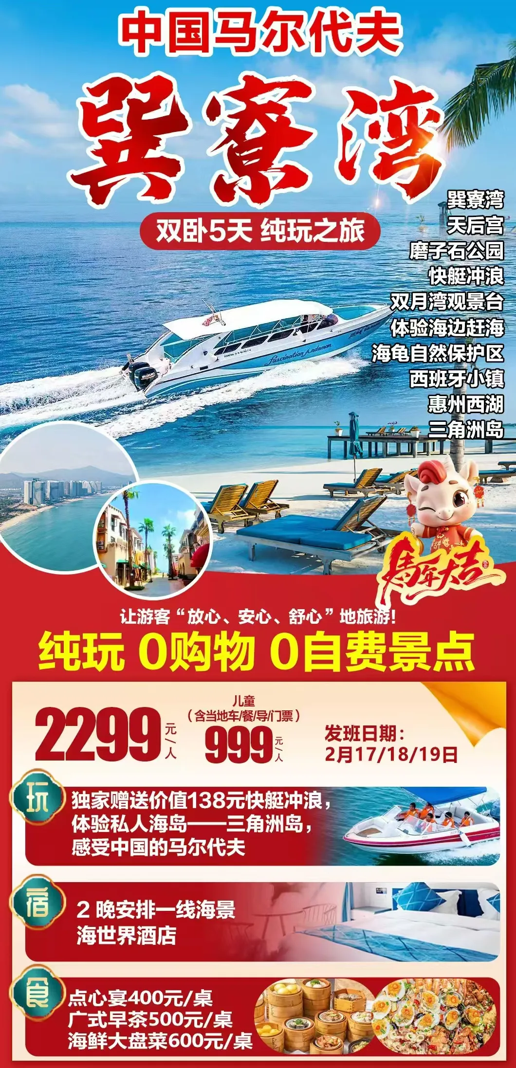 ★【巽寮湾】:中国马尔代夫度假天堂,巽寮湾踏浪,磨子石公园。★【快艇冲浪】:快艇出海,可近距离欣赏在海岛上栖息和在低空自由飞翔的海鸥。★【西班牙小镇】:旅游度假风情小镇,有文化广场、商业步行街等一系列风情设施。★【双月湾观景台】:一湾水一湾沙,两轮新月逐浪花。★【天后宫岭南民俗文化街】:体验岭南民俗文化街 【天后宫】为新年祈福 。★【华家班特技俱乐部】:国内唯一完美融合跑酷,街舞,汽车,摩托车特技表演。★【美食升级】:品尝广式点心宴, 升级一餐海鲜大盆菜,品味舌尖上的风味正餐!★【住得舒心】:2 晚安排海边一线酒店海景房,与大海近距离接触!★【新春有礼】:导游车上派发“新春利是”,新春利利事事,大吉大利!客人自行前往火车站,乘坐交通工具前往惠州。别名“鹅城”,寓意着幸运与 安宁,闲适的 生活、深幽的山水和浓厚的人文,素有“岭南名郡”“半城山色半城湖 ”之誉。参考车次:武昌-惠州:(T127/15:35-04:16+1、K435/16:48-07:32+1)以实际出票为准。第二天:惠州火车站—巽寮湾—天后宫—出海捕鱼—磨子 石公园—三角洲 早上抵达火车站,旅游大巴到达火车站,先到的客人可在车里休息,等齐所有团友后,乘车前往惠州巽寮湾海滨度假区(车程约 1.5 小时),抵达巽寮湾度假区,后首先前往【天后宫】为新年祈福, 天后宫民俗文化街古朴高雅、充满渔村独有的文化气息。主要包括天后宫、滨河酒吧街、特色购物餐 饮街区、演艺广场以及其他配套设施。建筑和园林的整体风格主要围绕岭南风情、妈祖文化、客家文 化、海洋文化等主题进行体现。后前往沙滩,在渔民的带领下乘坐渔船---【出海捕鱼】(约40分钟,如遇风雨或禁渔检查,此项目自行停止),体验真正以海为家,以渔为生,享受渔民收网的过程。 如果碰上鱼群,可撒网捕鱼,亲身感受捕鱼的乐趣。所得海产品归客人所有,可带往餐厅加工。午餐 后,前往欣赏惠东海岸线上最美的奇石群---【磨子石公园】(参观约 30 分钟)。徒步海岸线、摄影、 听涛、看海、观石、游泳、抓鱼的胜地.这里是天然的百年奇石公园。这里的巨石经大自然的神奇造 化,似磨菇、似灵芝、似海龟,似海象,令人浮想联翩,流连忘返。其中,以“风涛摧磨”风动石最 让人神醉。午餐品尝点心宴,后乘坐【快艇冲浪】,前往【三角洲岛】是中国第一个拥有合法产权的私人海 岛,海岛占地十六公顷,一向以“水清、石奇、沙幼” 三绝著称于南海。海岛是艳阳、蓝天、银沙、 碧海、奇石交织而成的世界,也是各种海洋生物和亚热带植物的天堂:海城遍布迷人的珊瑚群,橘黄 色的小丑鱼、横行的海蟹、带刺的海胆。如果你幸运还能一睹国家一级保护动物中华白海豚和绿海龟 地真容。岛上的天然奇石形态各异,惟妙惟肖,巧夺天工。近年来私人俱乐部的兴建和酒店化的管理 以及丰富多彩的海上运动娱乐项目,更让三角洲岛享有了“中国的马尔代夫”之美誉。后前往酒店办理入住手续,沙滩自由活动,游泳,拾贝,踏浪,享受愉快的度假时光......早餐后,乘车前往【双月湾观景台】(步行上山约 30 分钟,可自费乘坐上山车 20 元/人往返, 全程游玩约 2 小时左右)从花果山往下看就可看到美丽的双月湾。双月湾由大亚湾和红海湾畔相邻的 两个半月形海湾组成。两条沙垅直奔大星山,如蛟龙出海似双龙戏珠,有静有动,十分壮丽。大亚湾 畔的半月湾,微风细浪,阿娜多姿。红海湾畔的半月湾,波涛汹涌、气势磅薄。这里三面环海,风景 如画。洁白的沙滩,黛绿的林带,碧蓝的大海,多姿的礁石,迷人的小岛,穿梭的渔舟,构成了动静 交融的南海渔港风光。午餐品尝海鲜大盆菜,前往中国大陆 18000 公里海岸线唯一一个,也是唯一与人类最接近、实现 人与自然和谐的自然保护区,堪称"中国一绝"的国家级【海龟自然保护区】保护区三面环山,一面濒 海,沙滩陆地面积 2 平方公里,海洋面积 16 平方公里,海岸面积约 0.1 平方公里。这里环境僻静, 阳光、空气、水质均为一级(类)标准。近岸为沙质海底,有少量礁石,水深 5-15 米,夏秋水温 28 度左右,海水盐度常年在 30%以上。沙滩坡度平缓、沙粒细小,利于海龟爬行、挖掘和产卵繁殖。 后前往参观万科双月湾【西班牙风情小镇】,这里俨然是一座微缩版的西班牙小城,拍照留念感 受别样风情,之后前往万科海滩,在海滩上面踏浪,感受别样风情。晚餐自理。 晚上可自费前往观看【华家班特技俱乐部】(约 1 小时,门票自理 100 元/人)速度与激情,国 内唯一完美融合跑酷,街舞,汽车,摩托车特技表演,挑逗你的视觉神经,神龙摆尾、360 度大旋转、 单车漂移入库、汽车单轮行驶、队形绕桩、定点漂移旋转、摩托飞越、平地花式、影视特技跑酷…… 精湛技术,惊险刺激。一时间“华家班"的高超技艺与参与表演的帅哥、美媚,揪着我们数千现场观 众的心冲击激情巅峰。欢呼声、尖叫声……与汽车发动机的轰鸣声交织一起,此起彼伏,将现场汇聚成欢乐的海洋。第四天 巽寮湾--惠州西湖、丰渚园-火车站 早午餐 早餐后海边自由活动。11:30 酒店大堂集合,办理退房手续,午餐后乘车前往惠州市区(车程约 1.5 小时)后前往游览惠州市区参观荣获 5A级名胜风景区的【惠州西湖】在历史上曾与杭州西湖, 颖州西湖齐名。宋朝诗人杨万里曾有诗曰:“三处西湖一色秋,钱塘颖水与罗浮”说的就是这三大西 湖。当然,这三