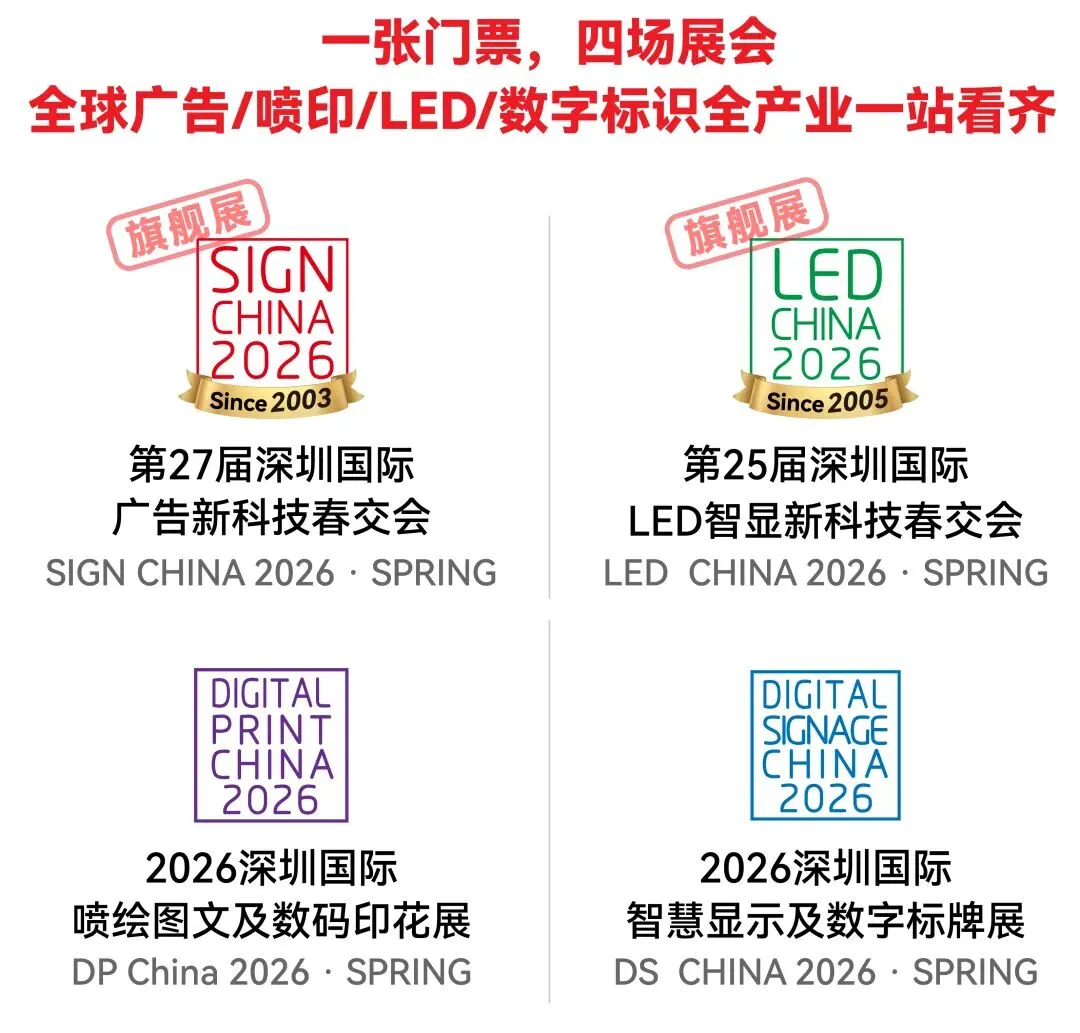 SIGN CHINA本次回归,不仅整合其独有的广告\喷印\LED\数字标识全产业链资源,更与姐妹品牌LED CHINA第25届深圳国际LED智显新科技春交会强强联手,为您全面打开广告行业数字化升级新机遇! 无论您是寻找商文体旅、零售美陈、展览展示、商业空间前沿创意解决方案,还是采购广告标识制作设备、智慧喷印技术、创新材料板材等核心资源,都无需东奔西跑,展会现场一站式满足供需对接!