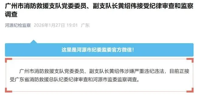据广东河源市纪委监委1月27日通报,广州市消防救援支队党委委员、副支队长黄绍伟涉嫌严重违纪违法,目前正接受广东省消防救援总队纪委纪律审查和河源市监委监察调查。