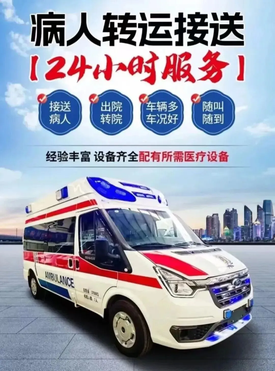 所有车辆均严格按照正规救护车标准打造,标配呼吸机、心电监护仪、高压氧气瓶、多功能担架床等全套急救设备,确保转运途中医疗保障无短板。同时随车配备持证上岗的专业医护人员,实时监测患者生命体征,针对突发病情可即时开展规范急救操作,筑牢转运途中的安全防线。