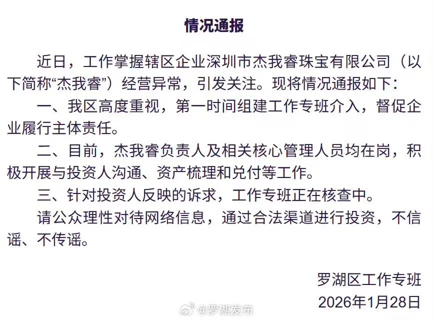 1月28日,罗湖区在官方微博“罗湖发布”中发布情况通报称,近日,工作掌握辖区企业深圳市杰我睿珠宝有限公司(以下简称“杰我睿”)经营异常,引发关注。深圳市罗湖区高度重视,第一时间组建工作专班介入,督促企业履行主体责任。