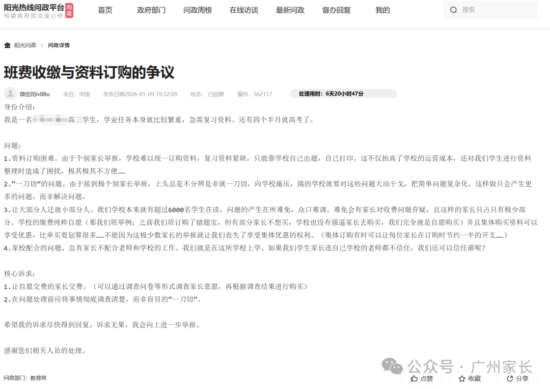 3.让大部分人迁就小部分人。我们学校本来就有超过6000名学生在读,问题的产生在所难免,众口难调。难免会有家长对收费问题存疑,且这样的家长只占只有极少部分。学校的缴费纯粹自愿(拿我们班举例:之前我们班订购了错题宝,但有部分家长不想买,学校也没有强逼家长去购买,我们完全就是自愿购买)并且集体购买资料可以享受优惠,比单买要划算很多……不能因为这极少数家长的举报就让我们丧失了享受集体优惠的权利。(集体订购有时可以让每位家长在订购时节约一半的开支……)