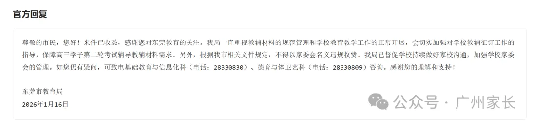 我局一直重视教辅材料的规范管理和学校教育教学工作的正常开展,会切实加强对学校教辅征订工作的指导,保障高三学子第二轮考试辅导教辅材料需求。
