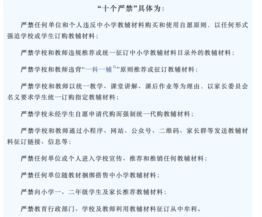 宁夏的“十个严禁”甚至比广东更为严格,包括严禁向小学一、二年级学生及家长推荐教辅材料,严禁通过小程序、网站、公众号、家长群等发送教辅材料征订链接等。