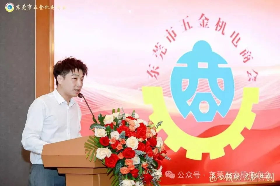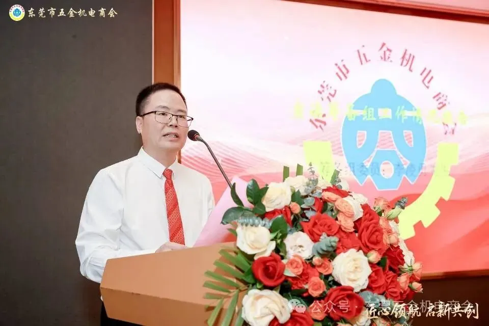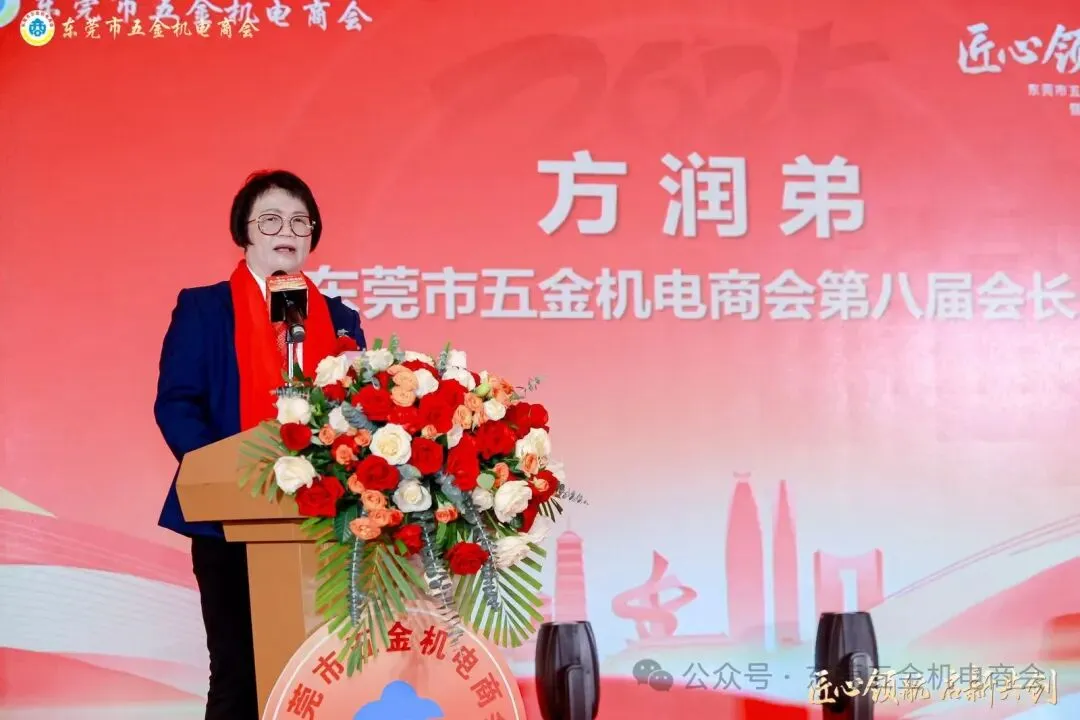 市委统战部副部长、市工商联党组书记陈国良书记发表讲话祝贺方润弟及第八届理监事会就职,并对各企业家对工商联工作的支持表示感谢。 及肯定了东莞五金机电商会历年成绩。接着讲到商会未来的政策机遇即中央、省、市出台系列政策支持民营经济,为民众提供发展机遇。明确了商会是兼顾政治与经济属性,政治上服务党政、宣传精神、引导人士跟党走的机构;经济上助力会员、融入发展、提升服务、推动转型的助推器。企业家应该要弘扬精神,做强主业,履行责任,构建和谐关系,参与公益,做行业典范。为大家提供了发展导向。最后表示市委统战部和工商联支持商会,相信在方润弟会长的带领下能实现新跨越,助力民营经济高质量发展。第七届会长陈启航发表讲话,对出席活动的领导、嘉宾和会员作出了热烈欢迎与衷心感谢,同时回顾了任职期间工作成果如搭建了交流平台、组织了展会、研讨会等活动,促进了会员合作与经验分享。服务会员企业,为企业排忧解难、提供融资支持。加强政企沟通,反映行业诉求、协助企业获取政策与技术支持。共克疫情难关,疫情期间组织防护用品、号召捐款捐物,获政府感谢信。接着,还切实提出对新一届商会的新期待、新展望,期望看到新一届领导成员加强自身建设,适应市场变化,拓展服务领域 。最后致谢与祝福,为未来描绘新蓝图。第八届会长方润弟发表就职演讲,对市委市政府等部门的关怀指导、会员们的信任支持以及对上一届领导班子的付出深感谢意与感恩。接着分析了未来形势即五金机电行业处于转型升级关键期,面临新机遇和挑战。同时阐述了工作重点是:加强商会建设,完善制度,提升管理和服务,打造优质团队;推动行业创新,鼓励研发,开展技术交流与培训;强化行业自律,引导诚信经营,建立信用评价体系;拓展市场,组织参展和经贸活动,加强国际交流合作。最后呼吁会员支持并表明决心:将以实际行动履职,带领商会迈向新辉煌!就职典礼——“交接使命,展望未来”