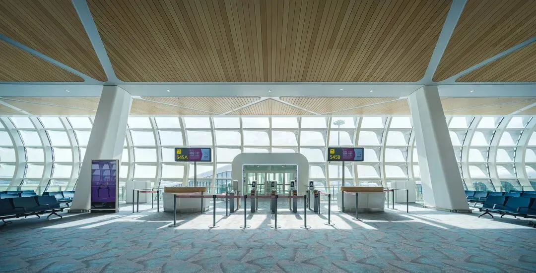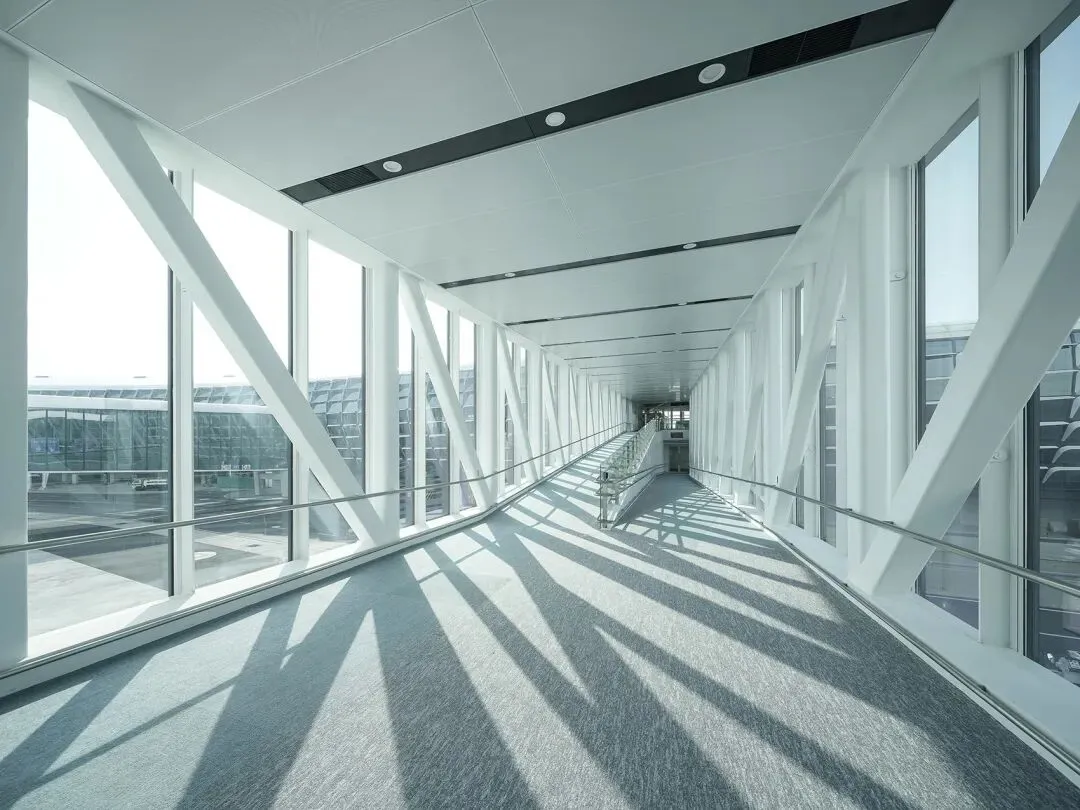设计通过三维软件优化,将遮阳构件规整为四种类型标准,节省造价的同时保证施工效率。弧形的双层幕墙立面打造出大气壮观的建筑形象。登机廊桥的设计雅致大气,打破了传统登机通道单纯的连接定位,与卫星厅的整体轮廓融为一体。廊桥内宽度为5.4米,宽敞的空间与优良的通风环境,极大提升了旅客的登机体验。