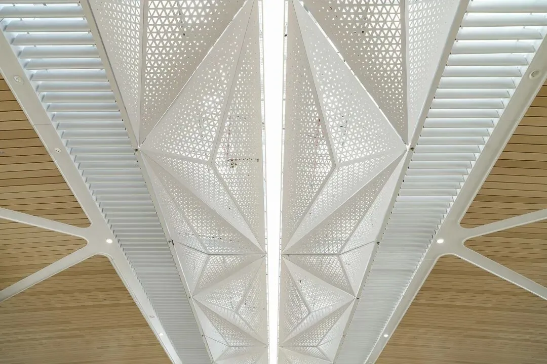 离开捷运站后,旅客将抵达位于卫星厅中央明亮高挑的中庭空间。长达1.2公里的天窗系统贯穿整个卫星厅,三棱锥渐变三角形穿孔铝板过滤太阳直射光,温暖的光线在仿木纹三角形天花图案的映衬下,以丰富的光影效果为旅客提供方向引导。设计围绕中庭打造了多层次且充满活力的深圳主题商业及餐饮空间,店面精心挑选材质及色调,与卫星厅和谐相融。