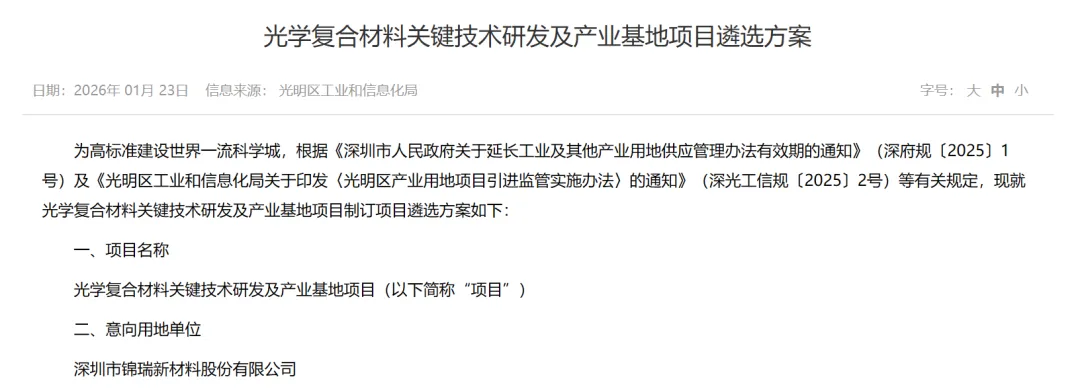 1月23日,深圳市光明区工业和信息化局披露《光学复合材料关键技术研发及产业基地项目遴选方案》。