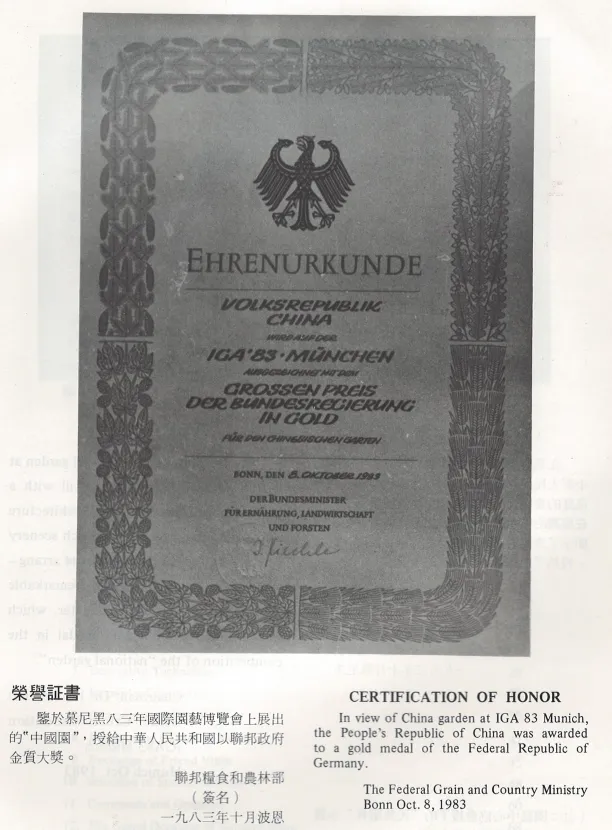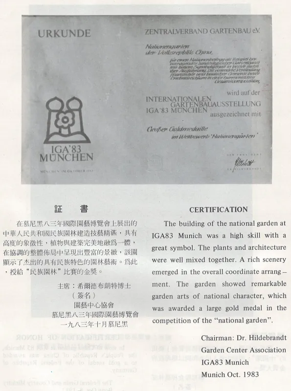 这个“中国园”在仅540平方米的有限地块上,以水体为核心巧布格局,既吸纳江南园林的幽雅曲折,又融入岭南园林的开朗明快,将“小中见大”“步移景异”的中国传统造园精髓发挥到极致。1983年开展后,这座“中国园”轰动欧洲,联邦德国总统亲临参观,在此停留良久。展览180天,吸引超800万人次的观览,被誉为“展会上的一颗明珠”。西方媒体评价它“令人心旷神怡”,每一步都能看到新的景色。最终这个“中国园”斩获德意志联邦共和国大金奖与联邦德国园艺建设中央联合会大金质奖章,成为我国首个在国际园艺展夺冠的作品。它展示了我国园林艺术成就,扩大了我国的政治影响,促进了友谊和文化交流,对我国园林事业的发展,对我国园林走向世界,具有重大意义,并将产生深远影响。