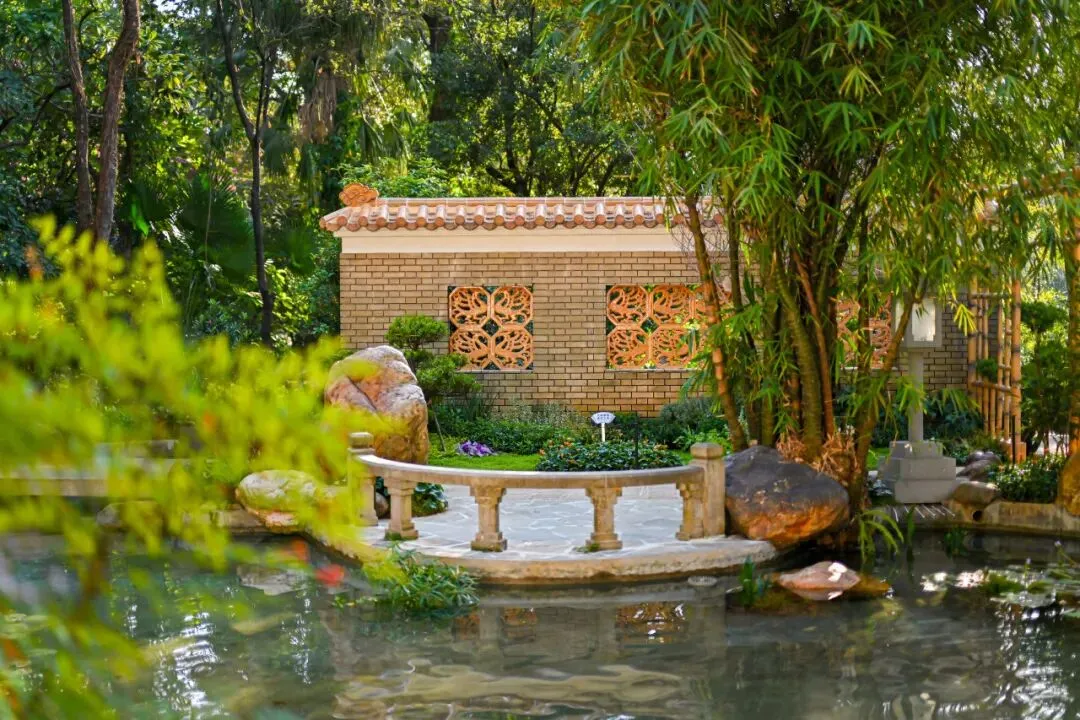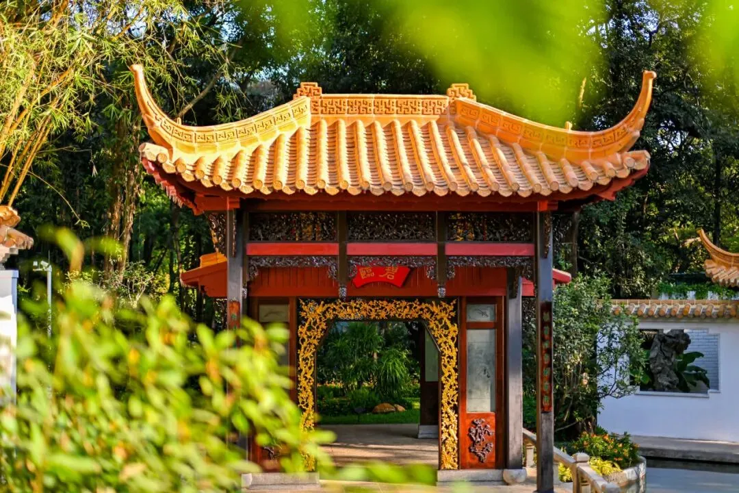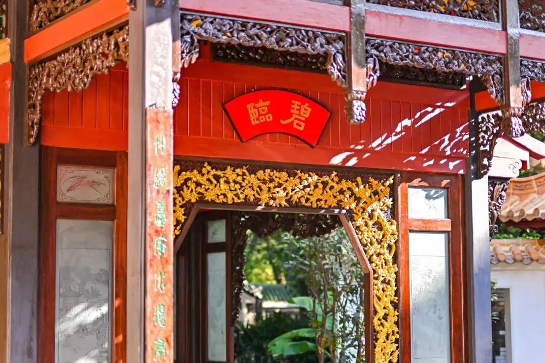 青砖缝间的纹路清晰诉说着当年随98吨构件漂洋过海的艰辛;明黄琉璃瓦覆盖的临碧舫,经四十余载风雨仍色泽温润,与水中倒影相映成趣;潮州木雕悬于亭廊,花鸟纹样“细而不腻”,当年精雕细琢的匠心,在如今的光影中依旧可见。