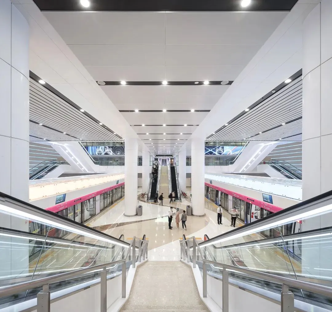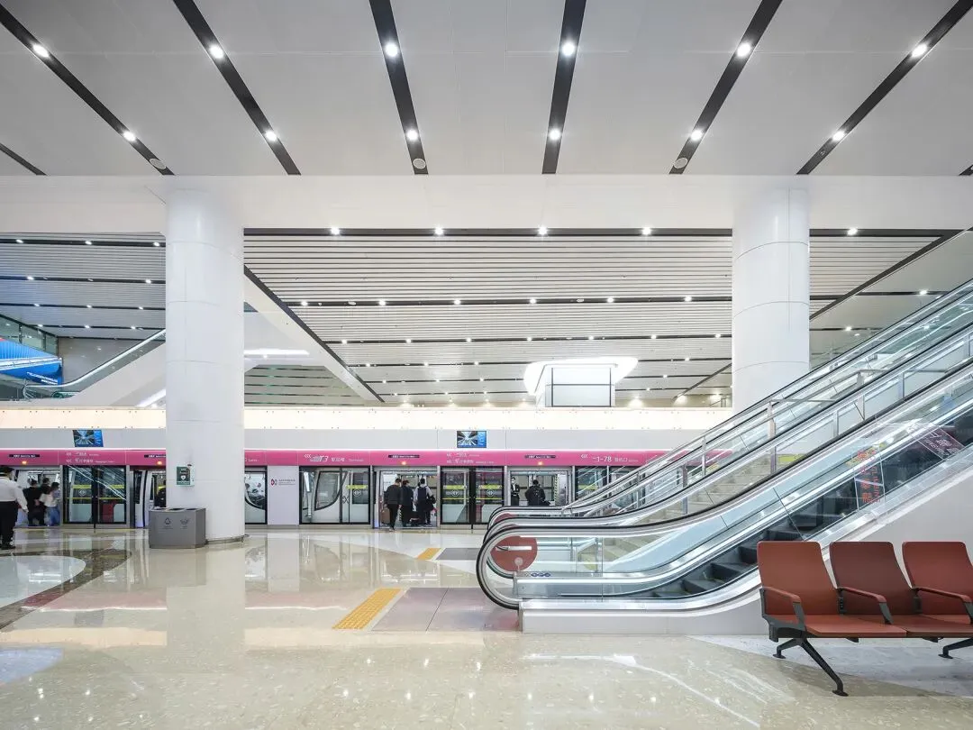 设计基于以人为本的原则,打造出与卫星厅无缝换乘的捷运站。捷运站内部采用暖色调石材墙地面,搭配银白色金属天花板,营造出高挑明亮的环境空间。出港站台设有鹏程之翼LED屏幕,以引导旅客乘坐扶梯通往出港厅。捷运屏蔽门顶盖设有与列车联动的灯带,当列车进出站时,灯带会转换色彩提醒旅客,旨在为旅客提供便捷无缝的交通体验。