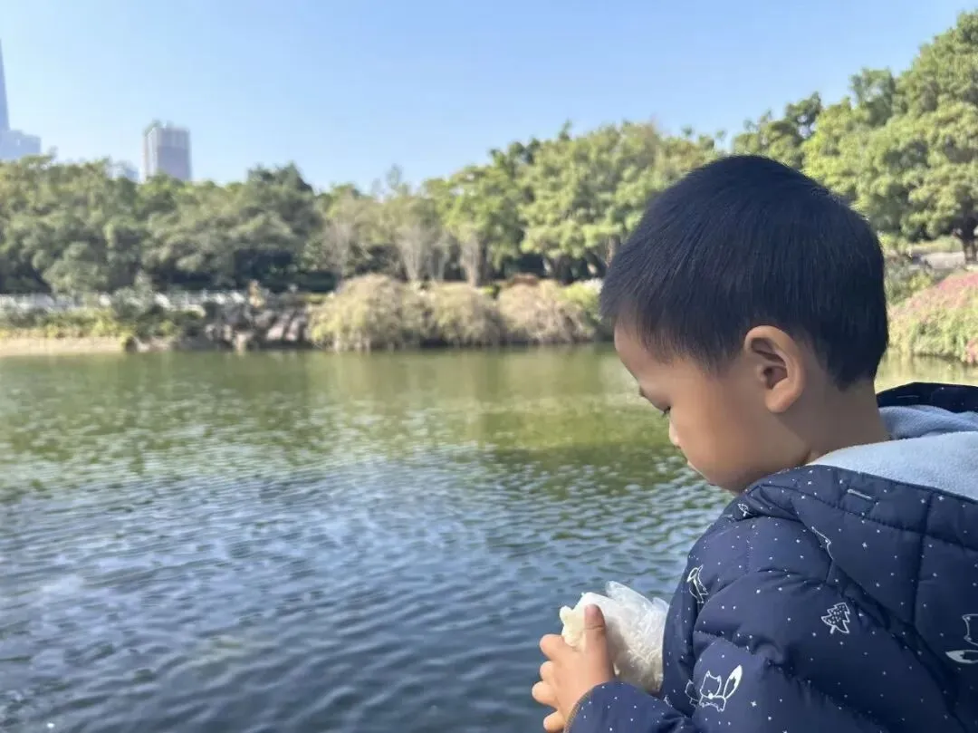 喂鱼:大门进去就是个大池塘,已经有很多小朋友在喂鱼了,拿出豆宝吃了一半的馒头,丢丢来喂鱼,池塘边也有卖鱼粮的,五块两包,大门口还有五块五包的,价格还行,当然自带馒头、面包零食投喂,不花钱。