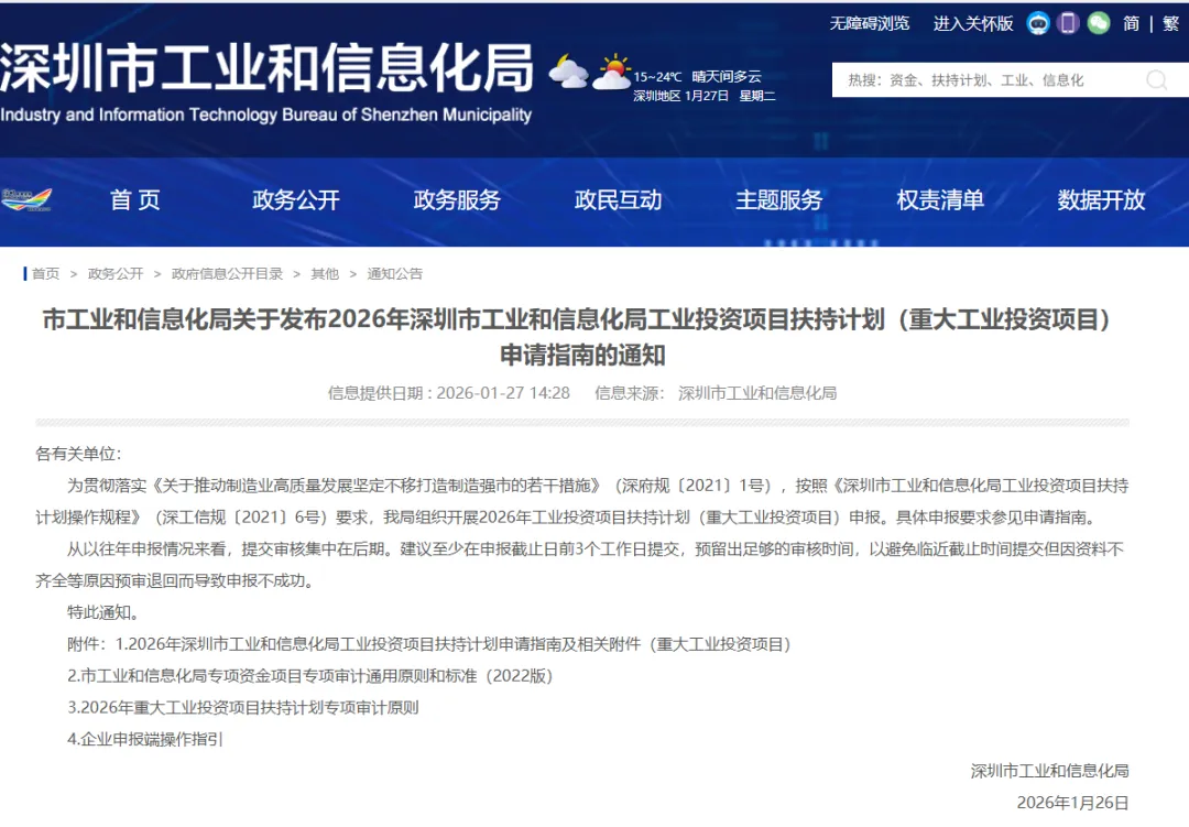 深圳市再次以真金白银,为实体经济的根基——工业投资注入强心剂。2026年度的深圳市工业投资项目扶持计划申报窗口已于今日(1月27日)正式开启。这是一项针对重大工业项目的重磅资助,单个项目最高可获5000万元支持,资助比例最高可达项目合规投资的20%。