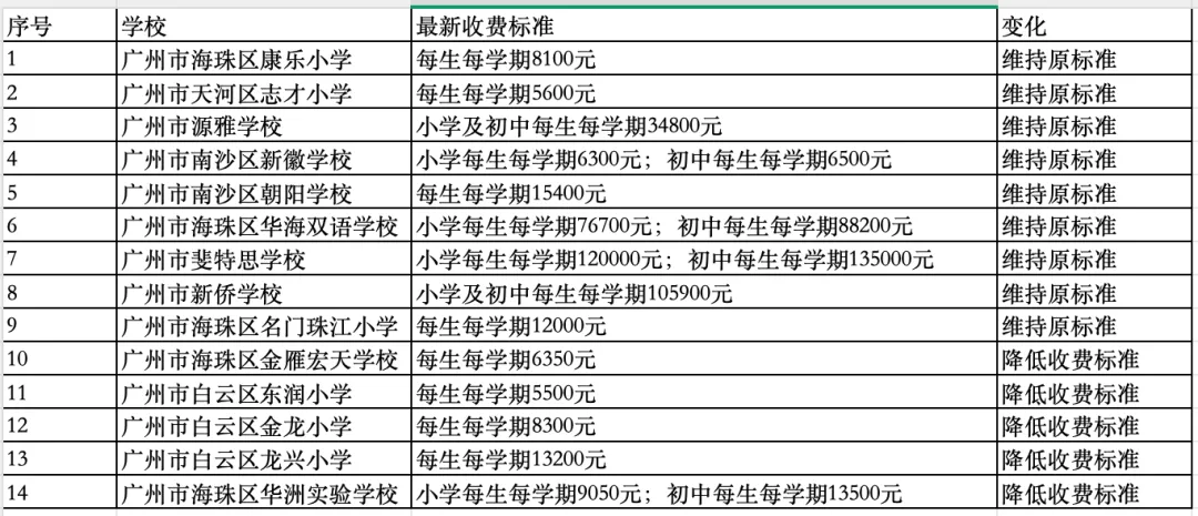 近日,广州市发展和改革委员会公布关于广州市源雅学校、广州市新侨学校、广州市斐特思学校等14所学校收费标准的批复,其中,对广州市海珠区华洲实验学校、广州市白云区龙兴小学、广州市白云区金龙小学、广州市白云区东润小学、广州市海珠区金雁宏天学校等5所学校予以降低收费标准。相关收费标准从2026年秋季学期开始执行。