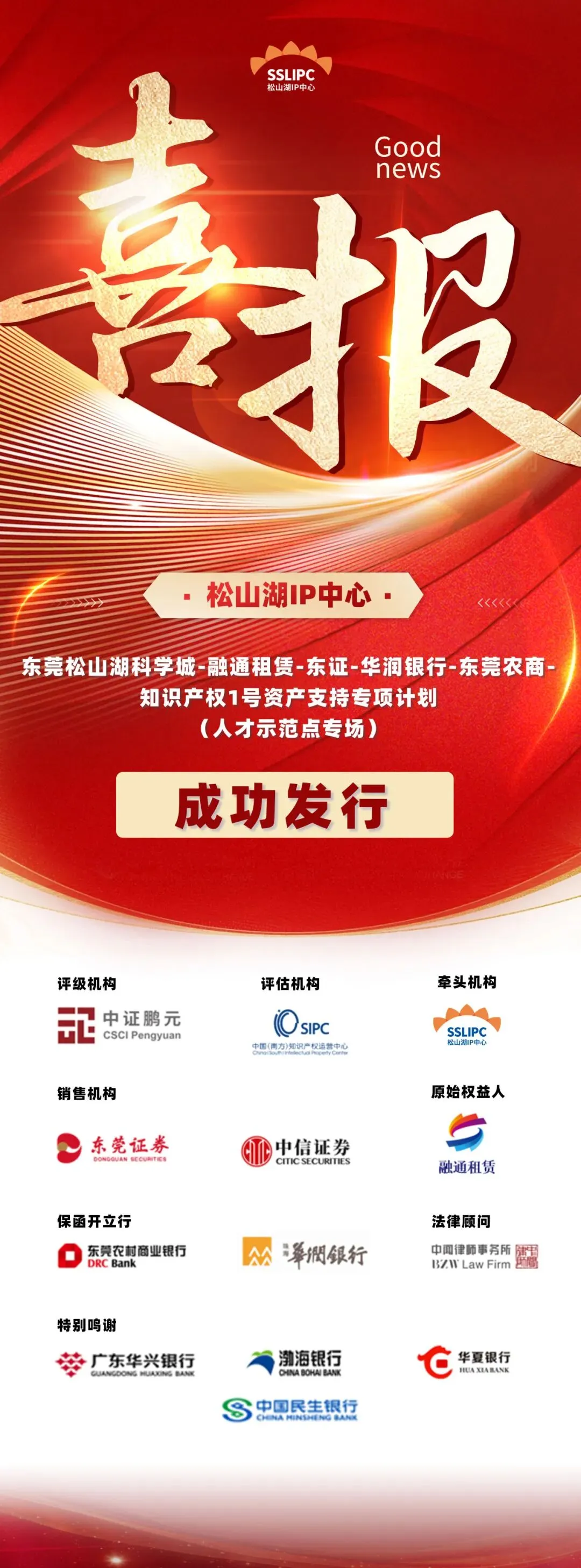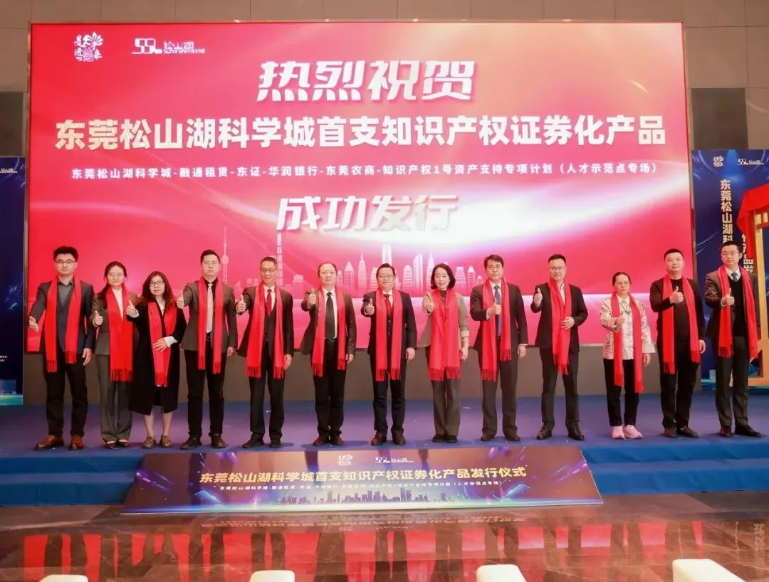 为深入贯彻落实国家省市知识产权高质量发展部署,在东莞市委组织部和东莞市市场监督管理局的指导支持下,近日,由南方中心作为评估机构的松山湖科学城发行首支知识产权证券化产品——东莞松山湖科学城-融通租赁-东莞证券-华润银行-东莞农商-知识产权1号资产支持专项计划(人才示范点专场)成功发行,为区域高质量发展筑牢金融支撑。