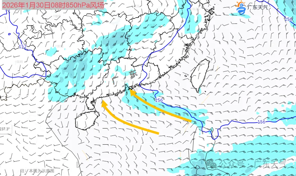 广东省气象台预计,1月29日至30日白天,地面冷高压东移入海,按照天气系统的常规演变,其后部会将暖湿的东南风送上岸,全省开启增温增湿模式。天空云量随之增多,部分市县会出现弱降水,雨雾天气也会愈发明显。