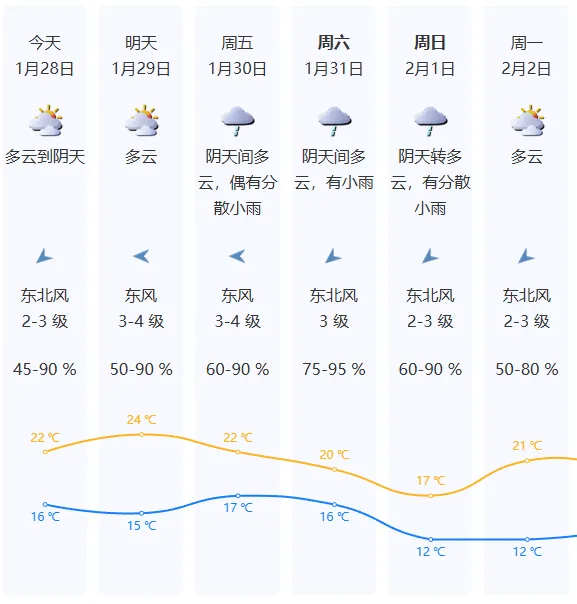 1月30日阴天有小雨,日温差减小,东部沿海最大阵风7级;